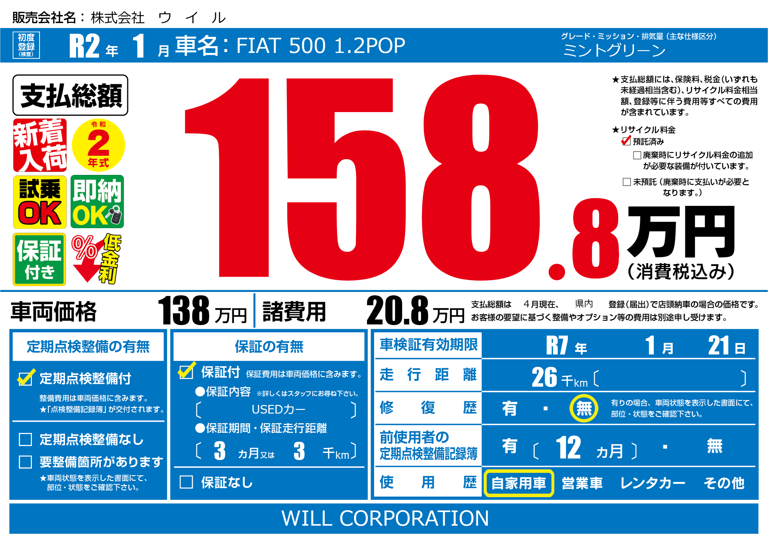 | 車名 | FIAT 500 1.2POP | グレード ミッション 排気量 |