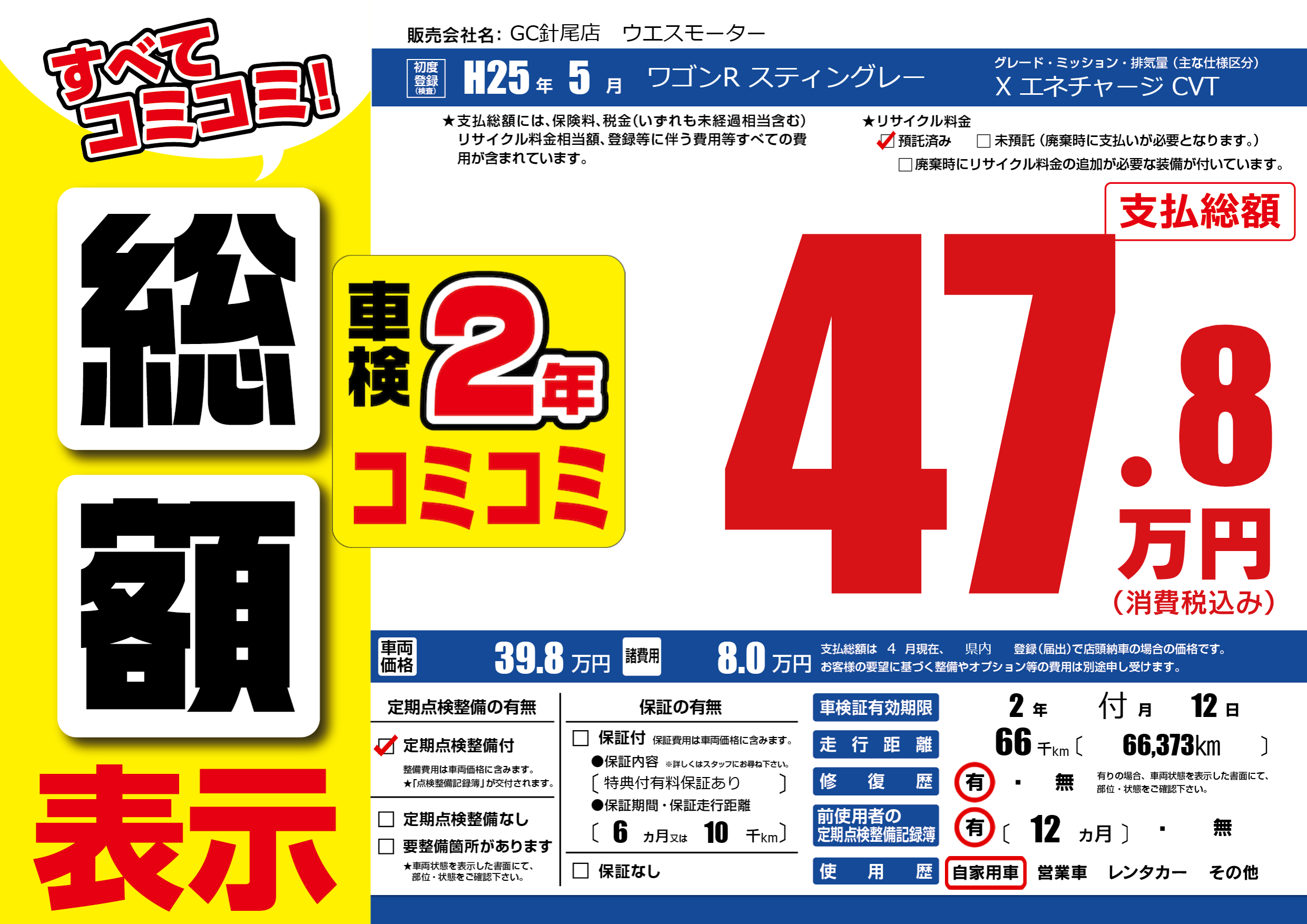 | 車名 | ワゴンR スティングレー | グレード ミッション 排気量 |