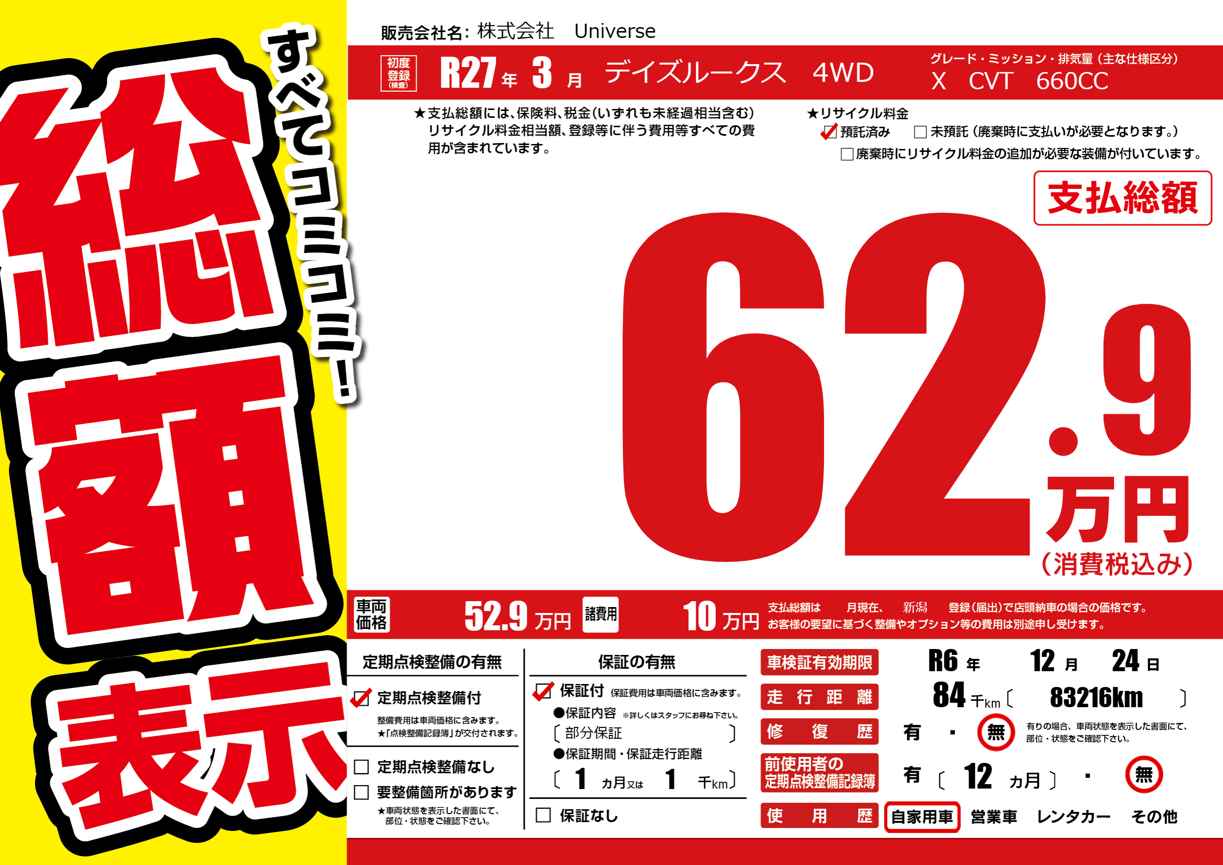 | 車名 | デイズルークス 4WD | グレード ミッション 排気量 |