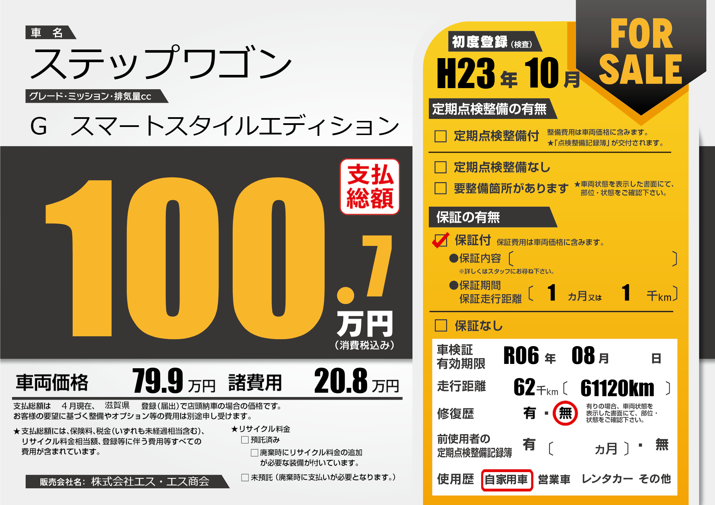 | 走行キロ | 6.2万km | 初年度登録 | H23年10月 |