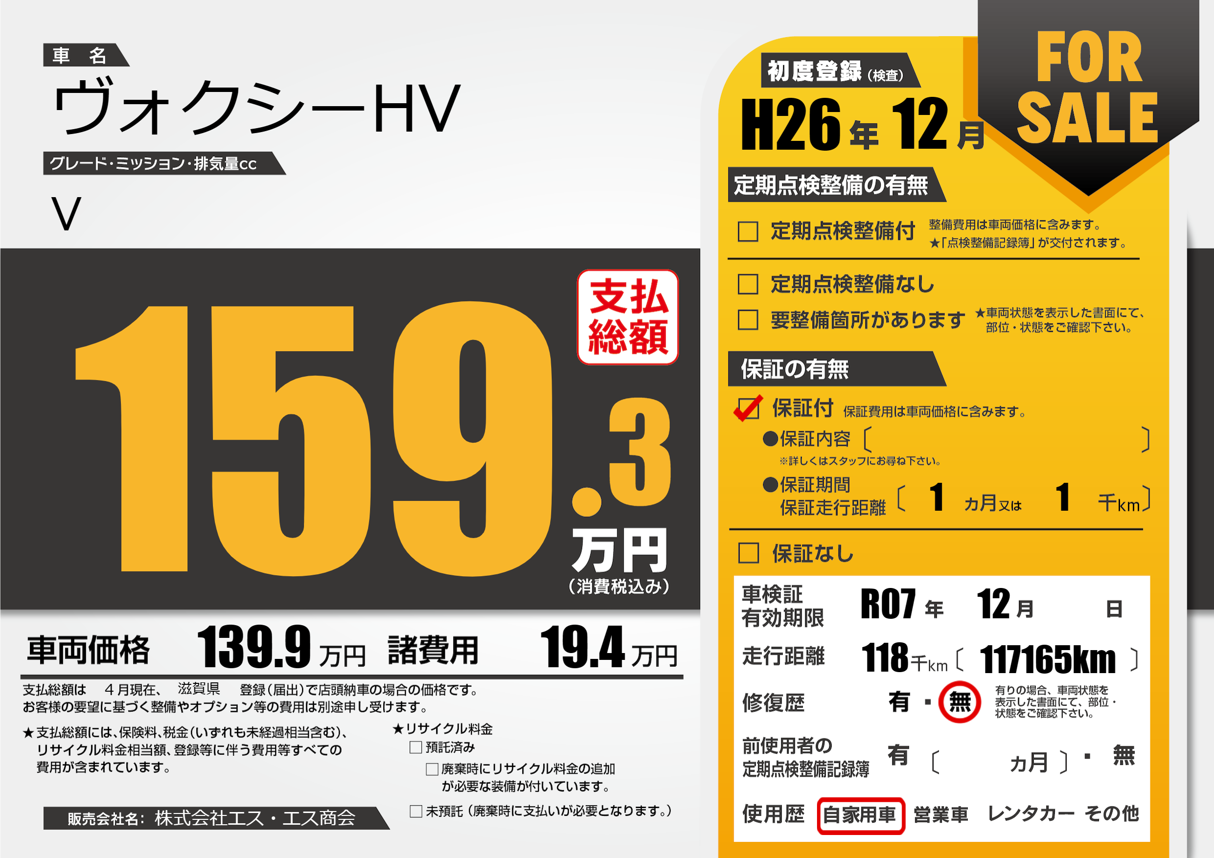 | 車名 | ヴォクシーHV | グレード ミッション 排気量 |
