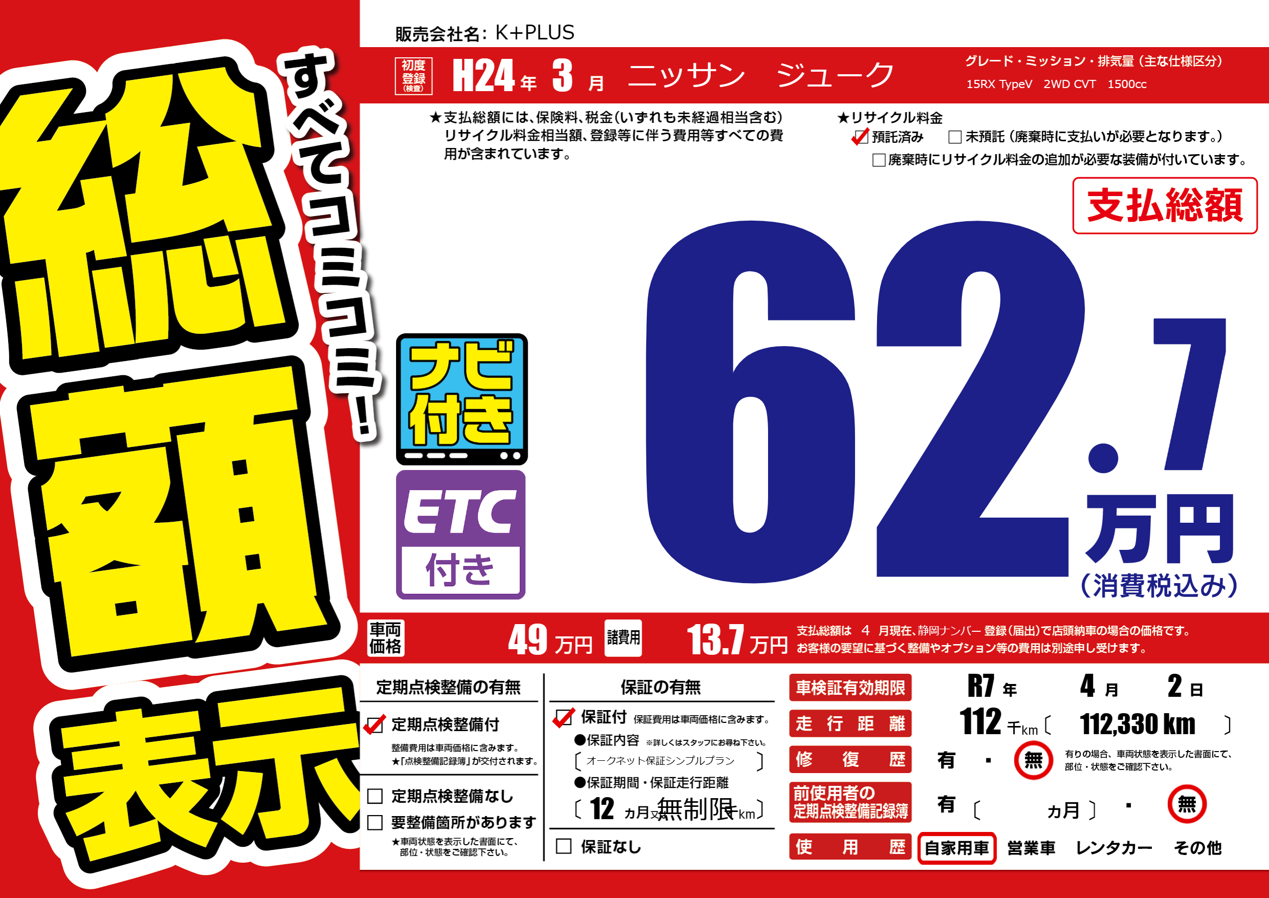 | 車検制限 | R7年 4月 2日 | ||