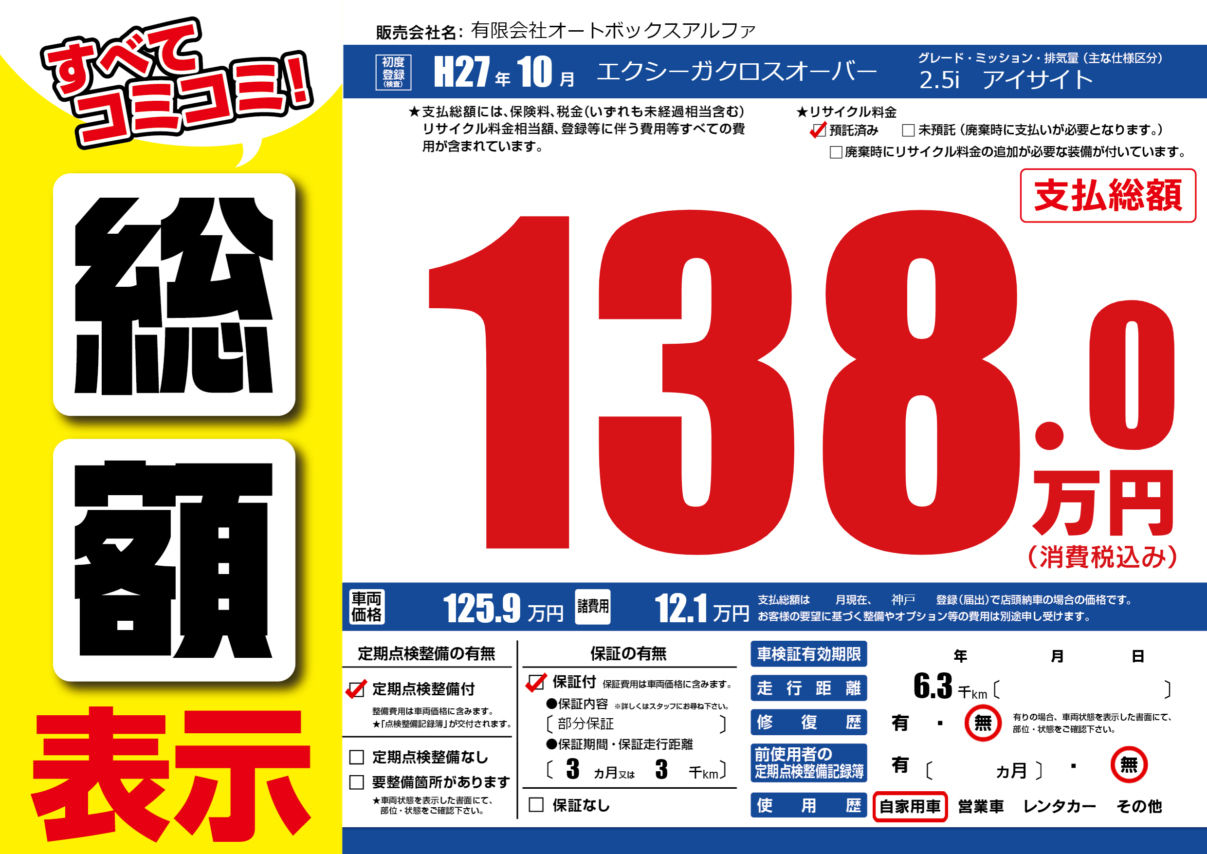 | 車名 | エクシーガクロスオーバー | グレード ミッション 排気量 |