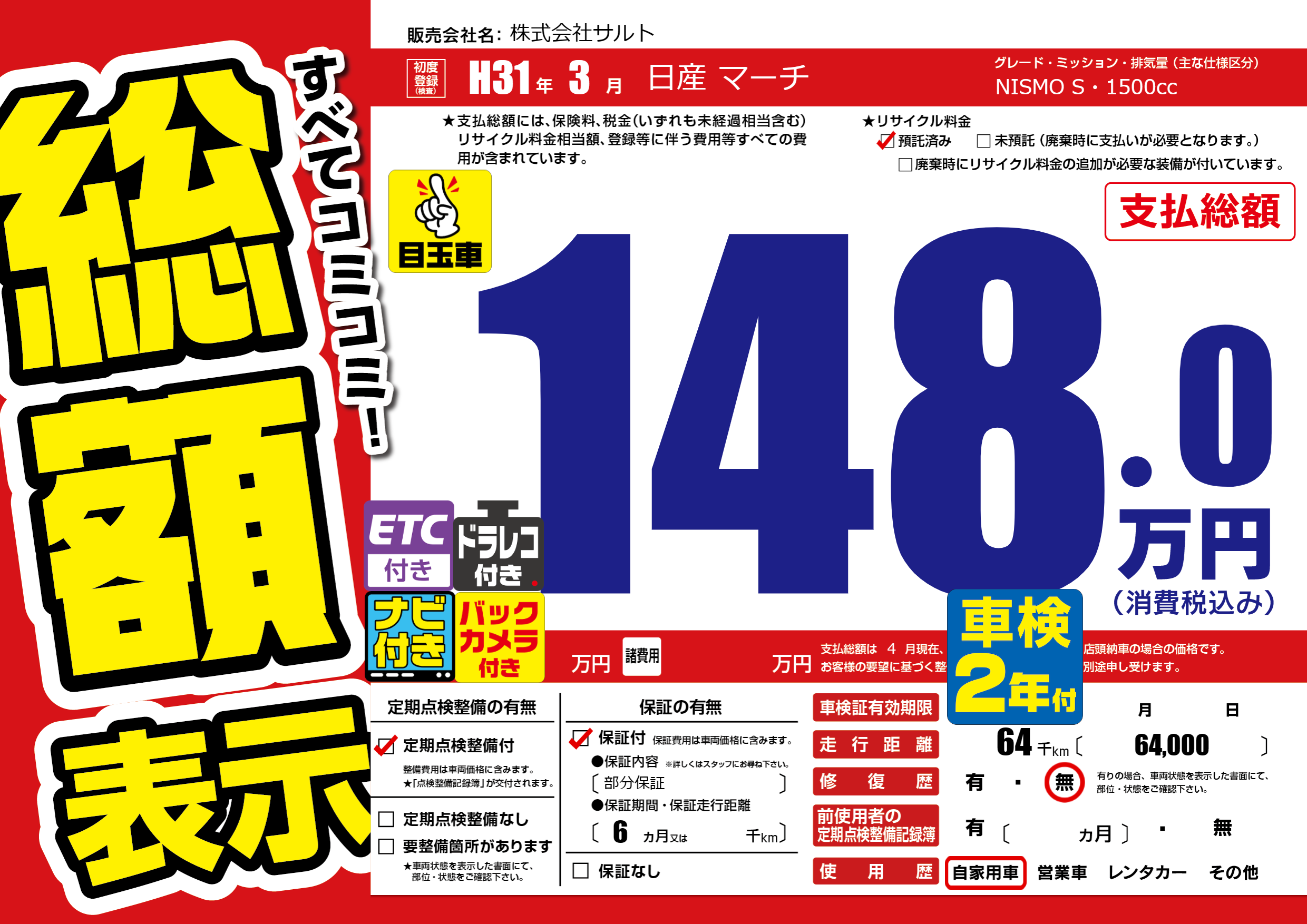 | 車名 | 日産 マーチ | グレード ミッション 排気量 |