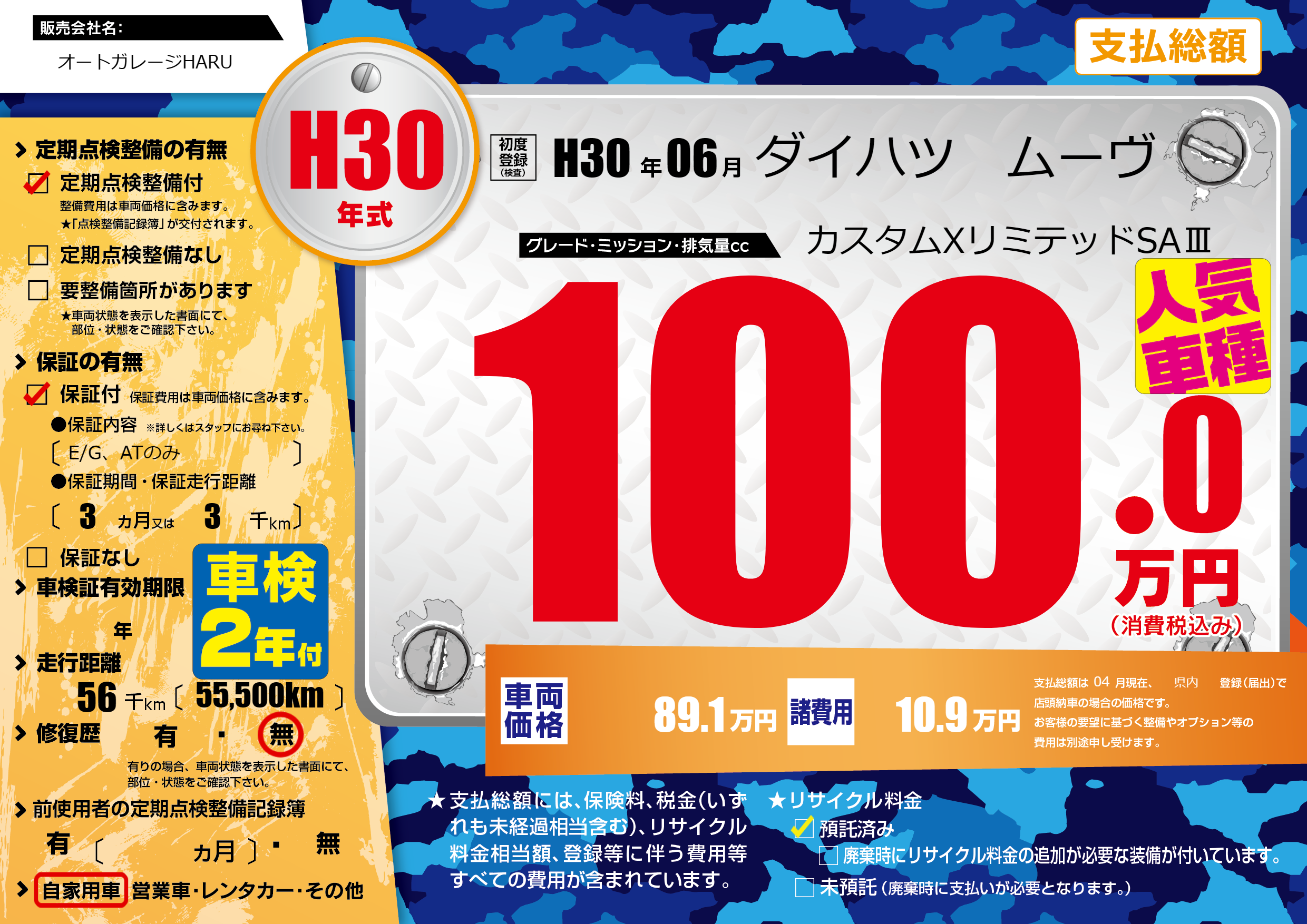 | 車名 | ダイハツ ムーヴ | グレード ミッション 排気量 |
