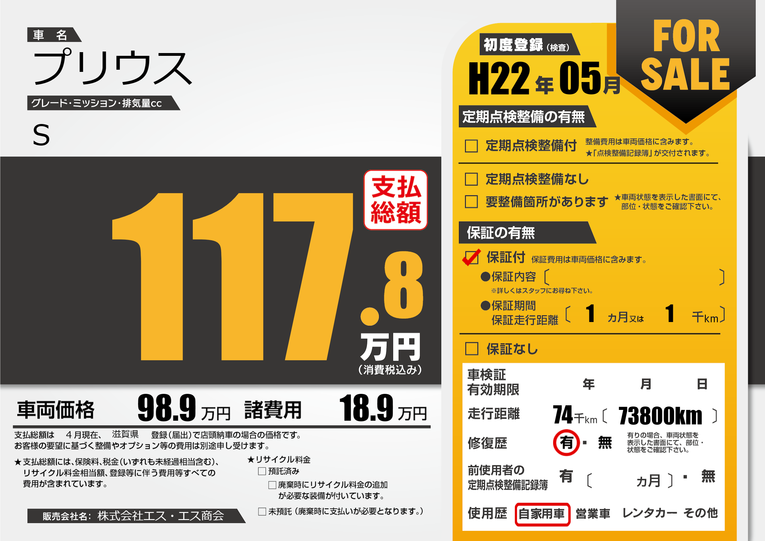 | 車名 | プリウス | グレード ミッション 排気量 |
