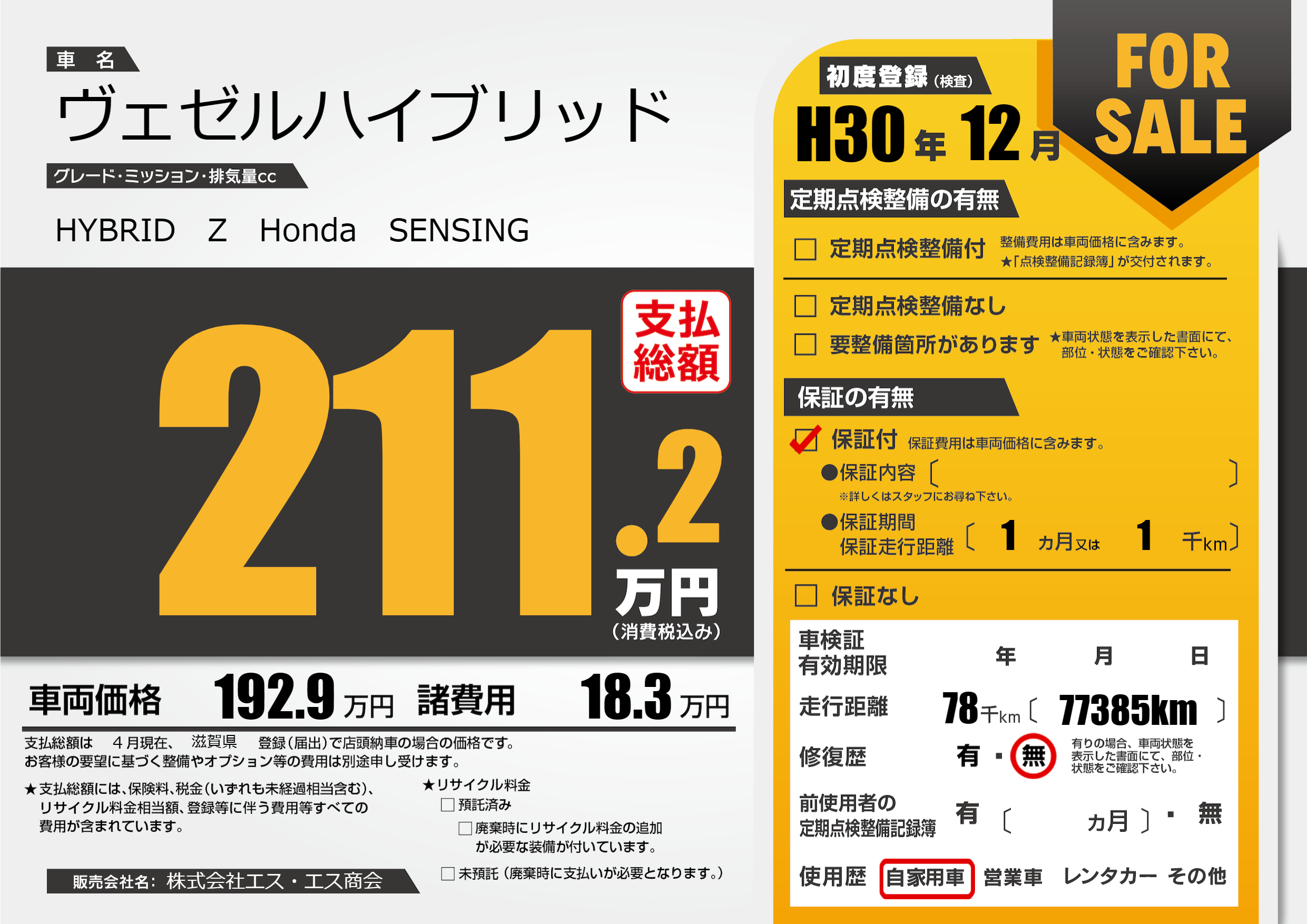 | 車名 | ヴェゼルハイブリッド | グレード ミッション 排気量 |
