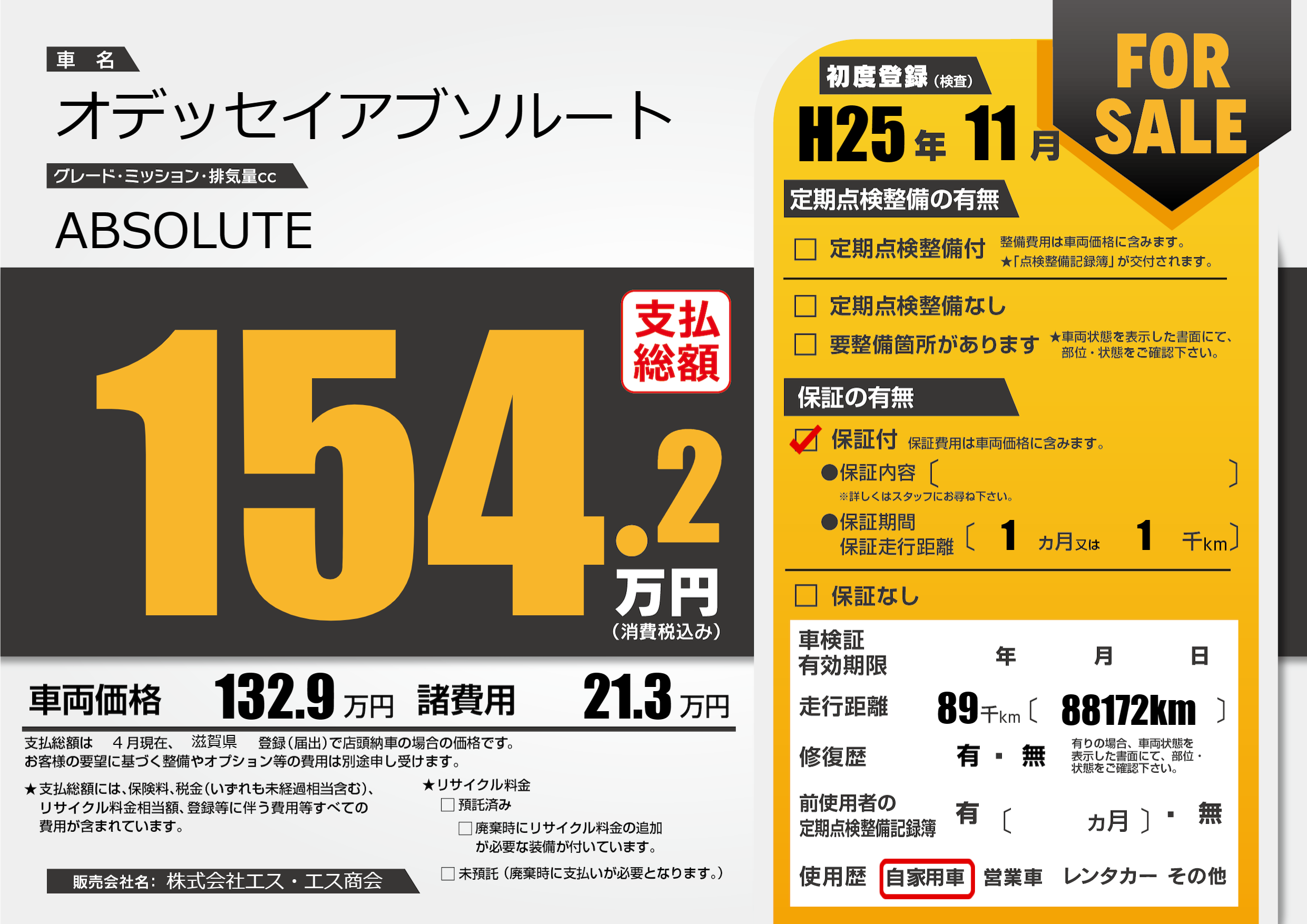 | 走行キロ | 8.9万km | 初年度登録 | H25年11月 |