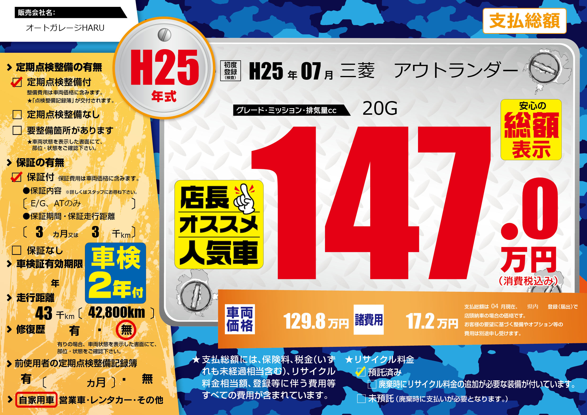 | 走行キロ | 4.3万km | 初年度登録 | H25年07月 |