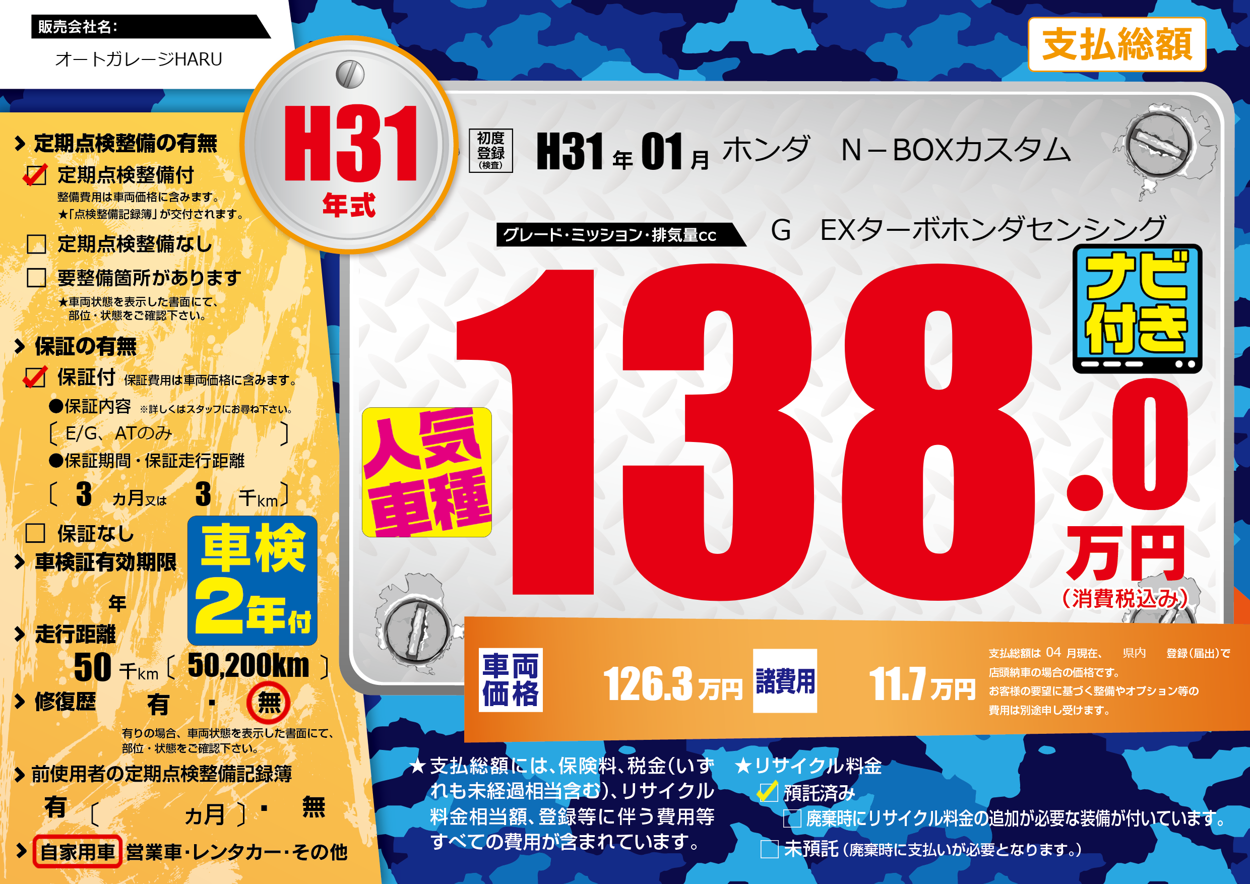 | 車名 | ホンダ N-BOXカスタム | グレード ミッション 排気量 |