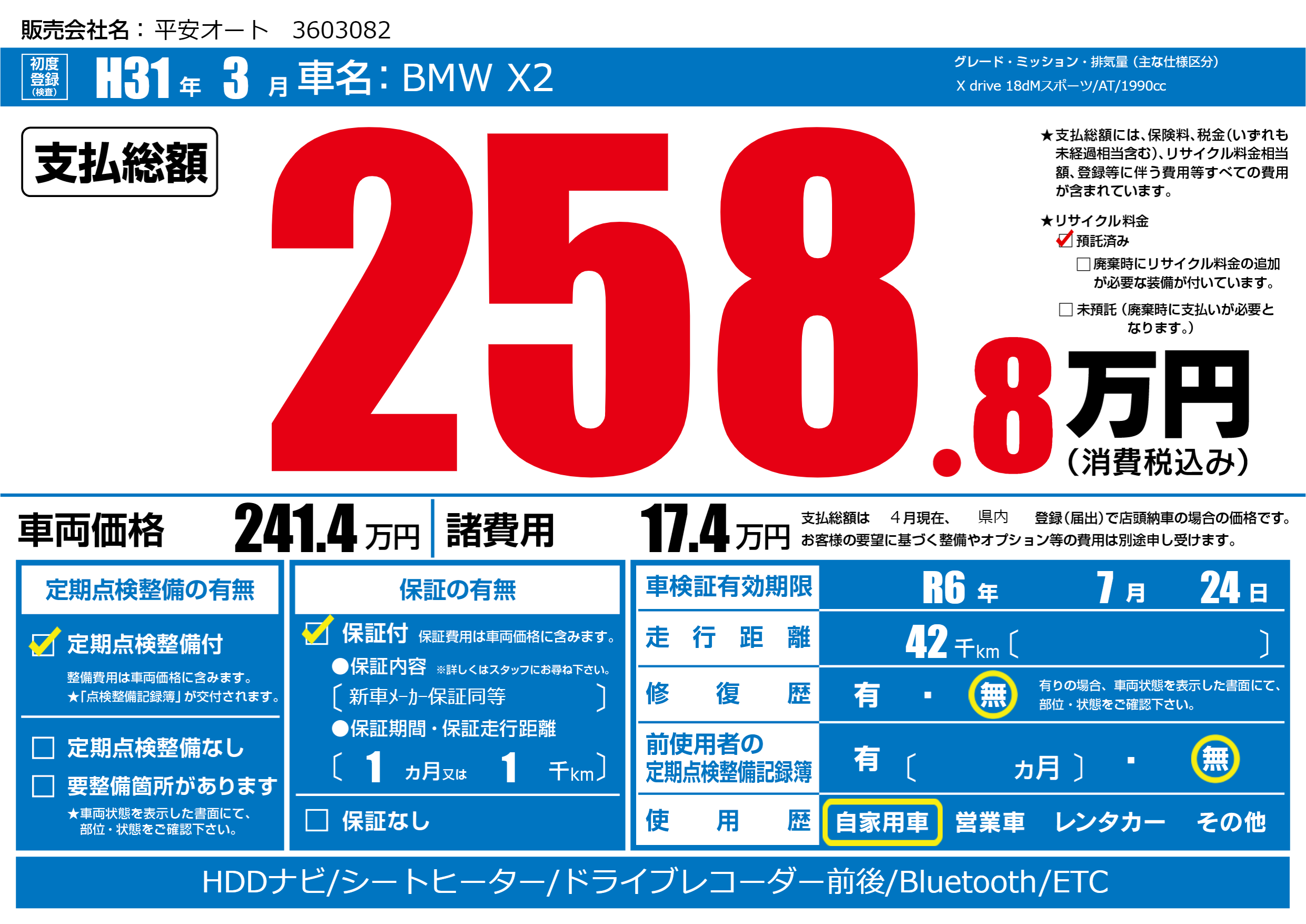 | 車名 | BMW X2 | グレード ミッション 排気量 |