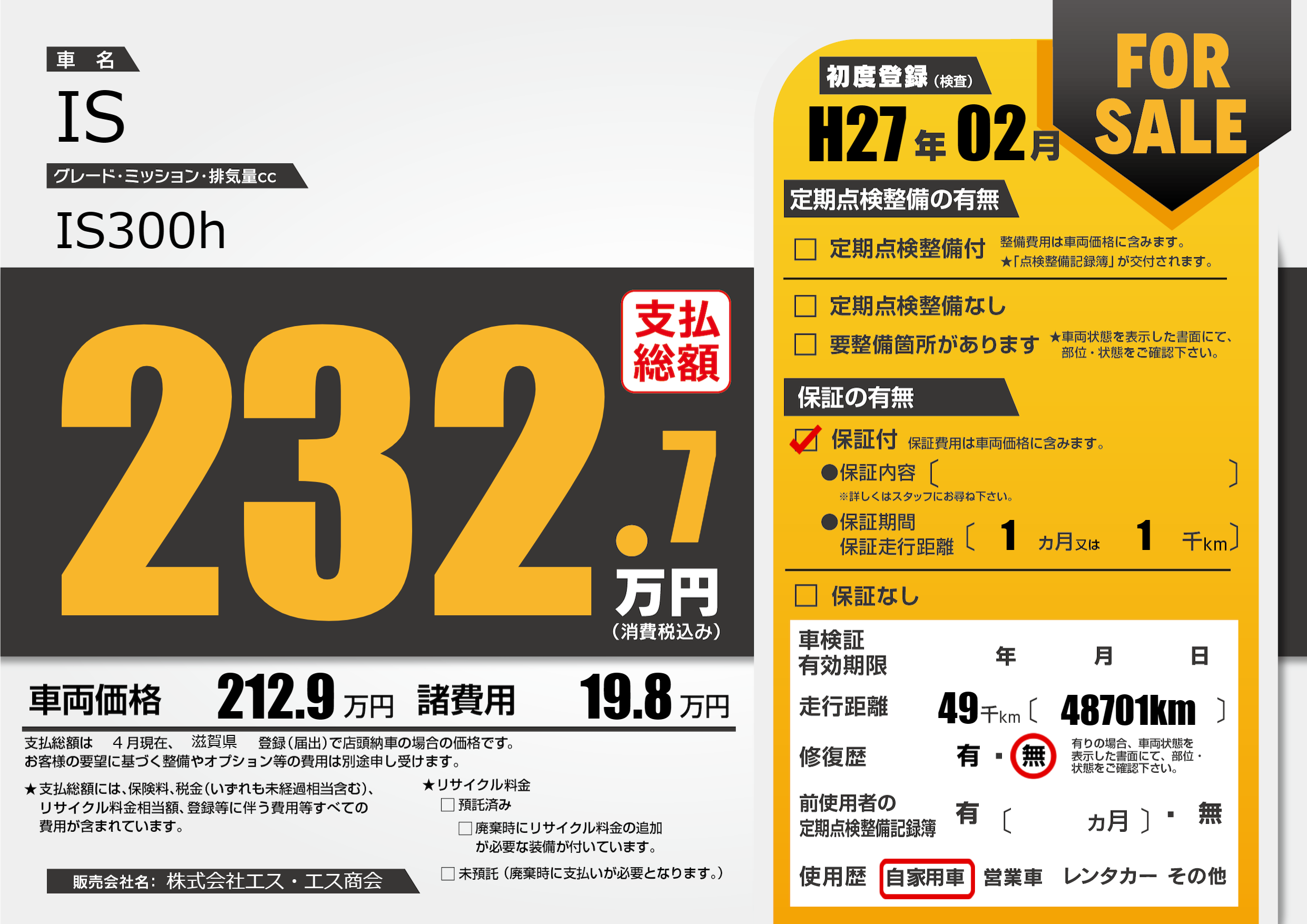 | 走行キロ | 4.9万km | 初年度登録 | H27年02月 |