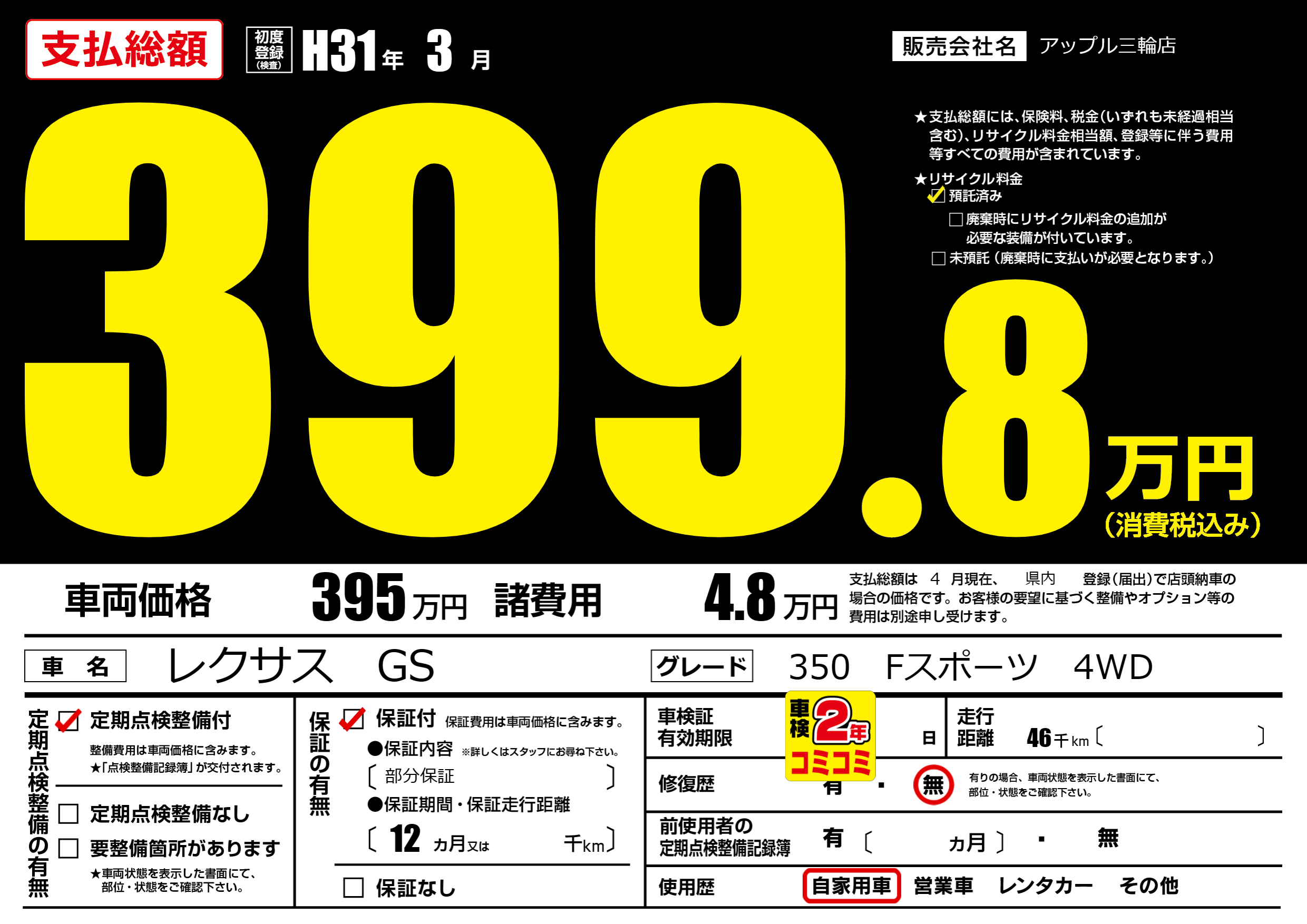 | 車名 | レクサス GS | グレード ミッション 排気量 |