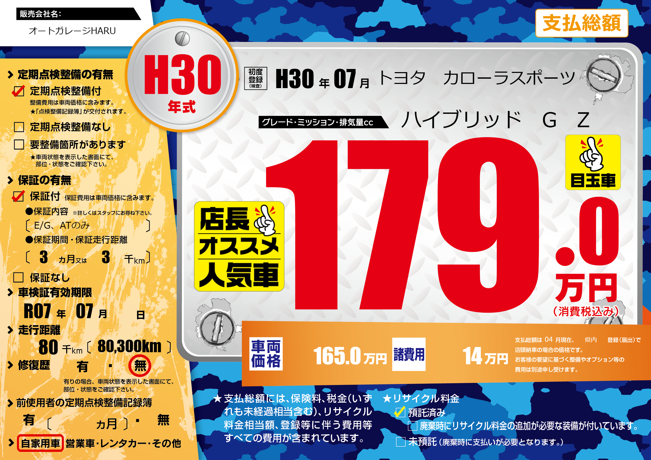 | 走行キロ | 8万km | 初年度登録 | H30年07月 |