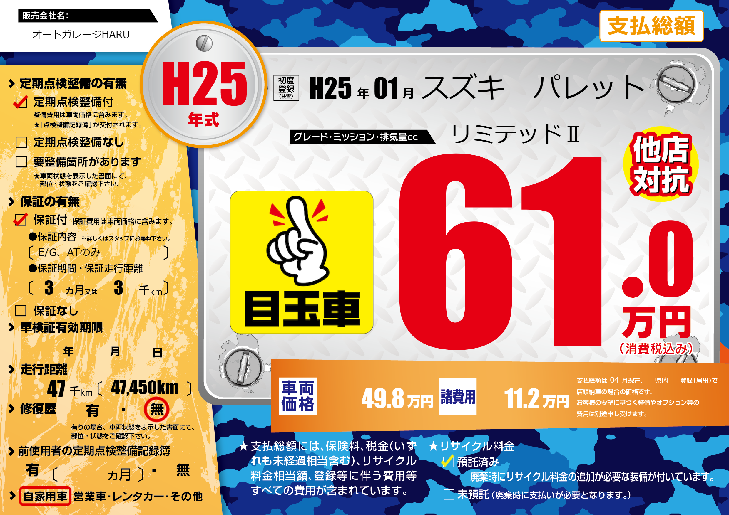 | 車名 | スズキ パレット | グレード ミッション 排気量 |