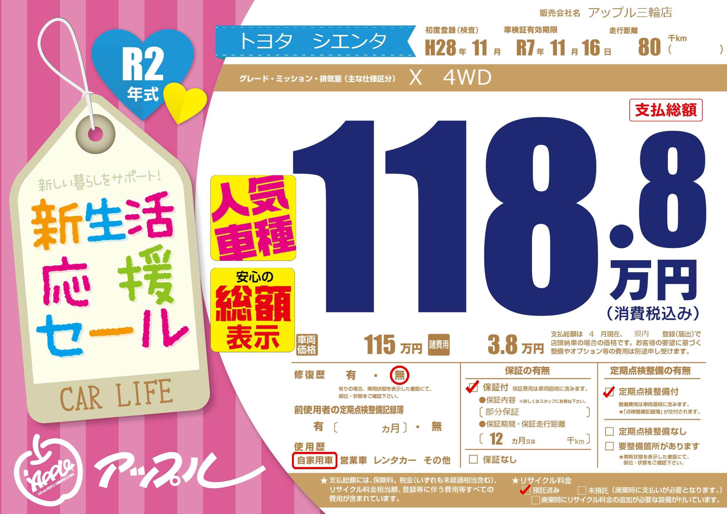 | 車名 | トヨタ シエンタ | グレード ミッション 排気量 |