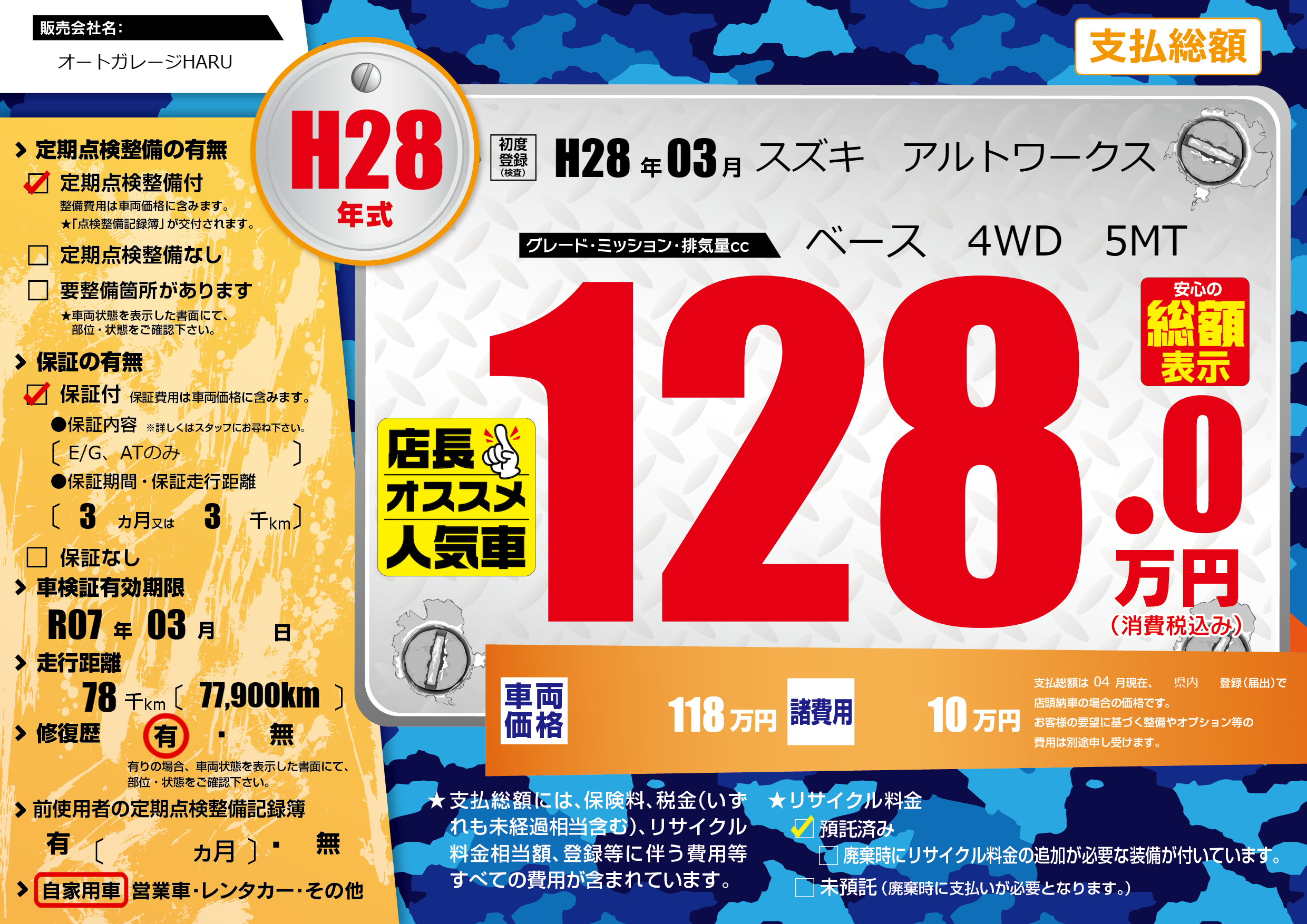 | 車検制限 | R07年 03月 - 日 | ||