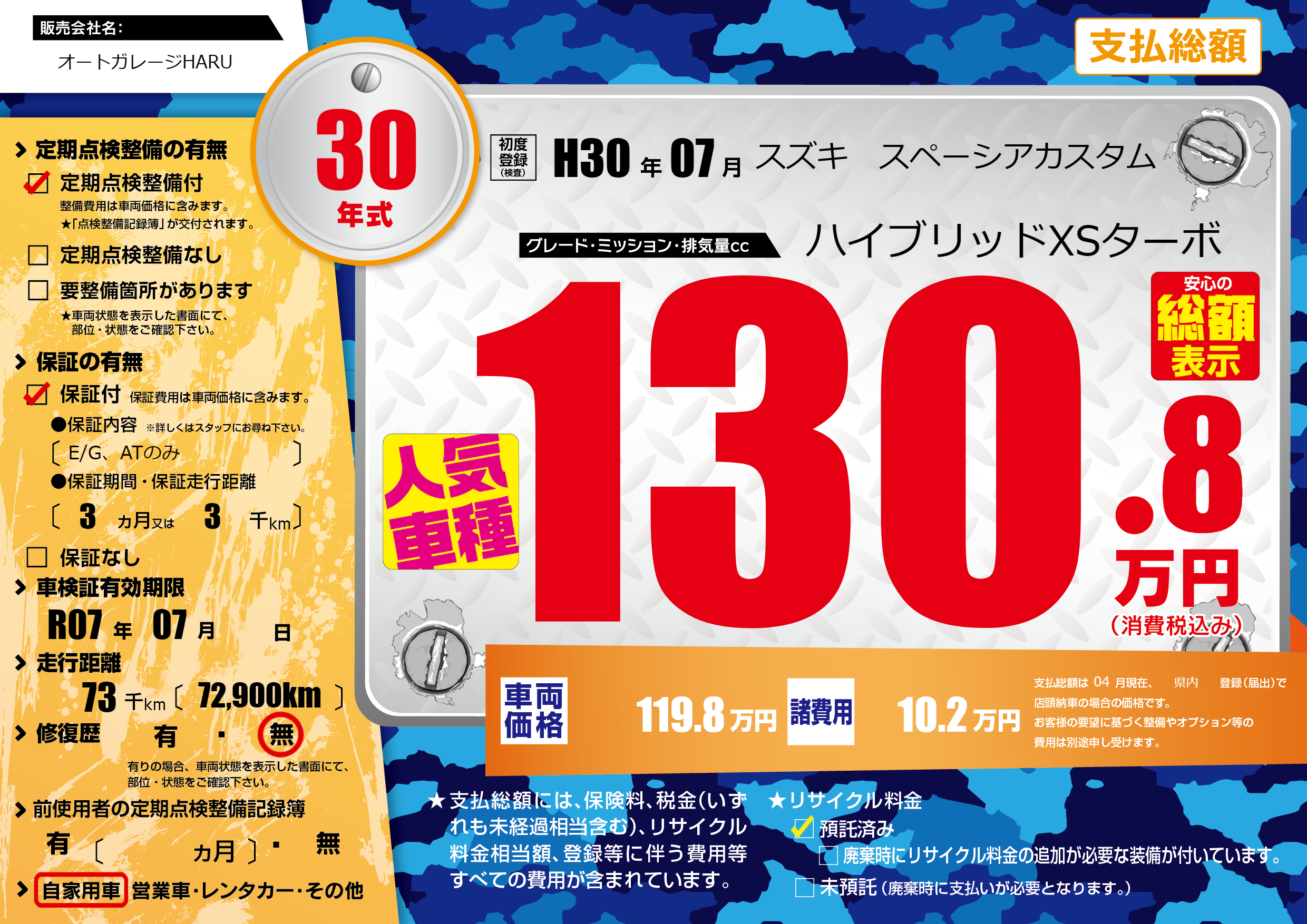 | 車名 | スズキ スペーシアカスタム | グレード ミッション 排気量 |
