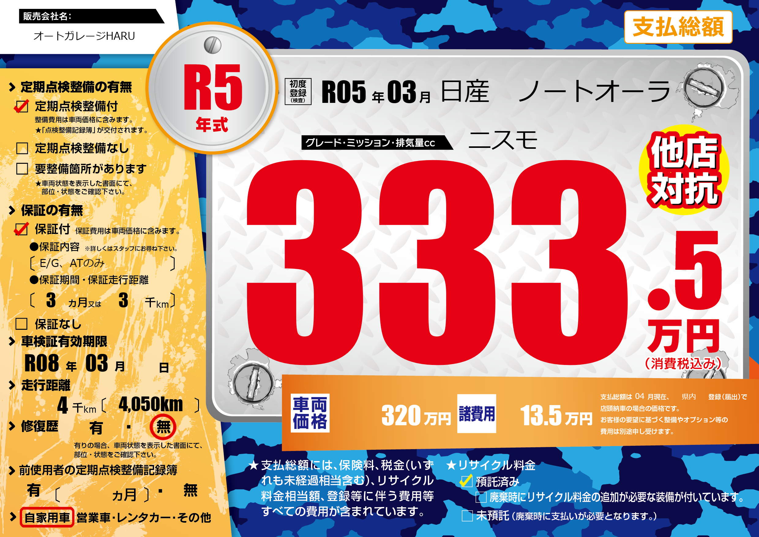 | 車検制限 | R08年 03月 - 日 | ||