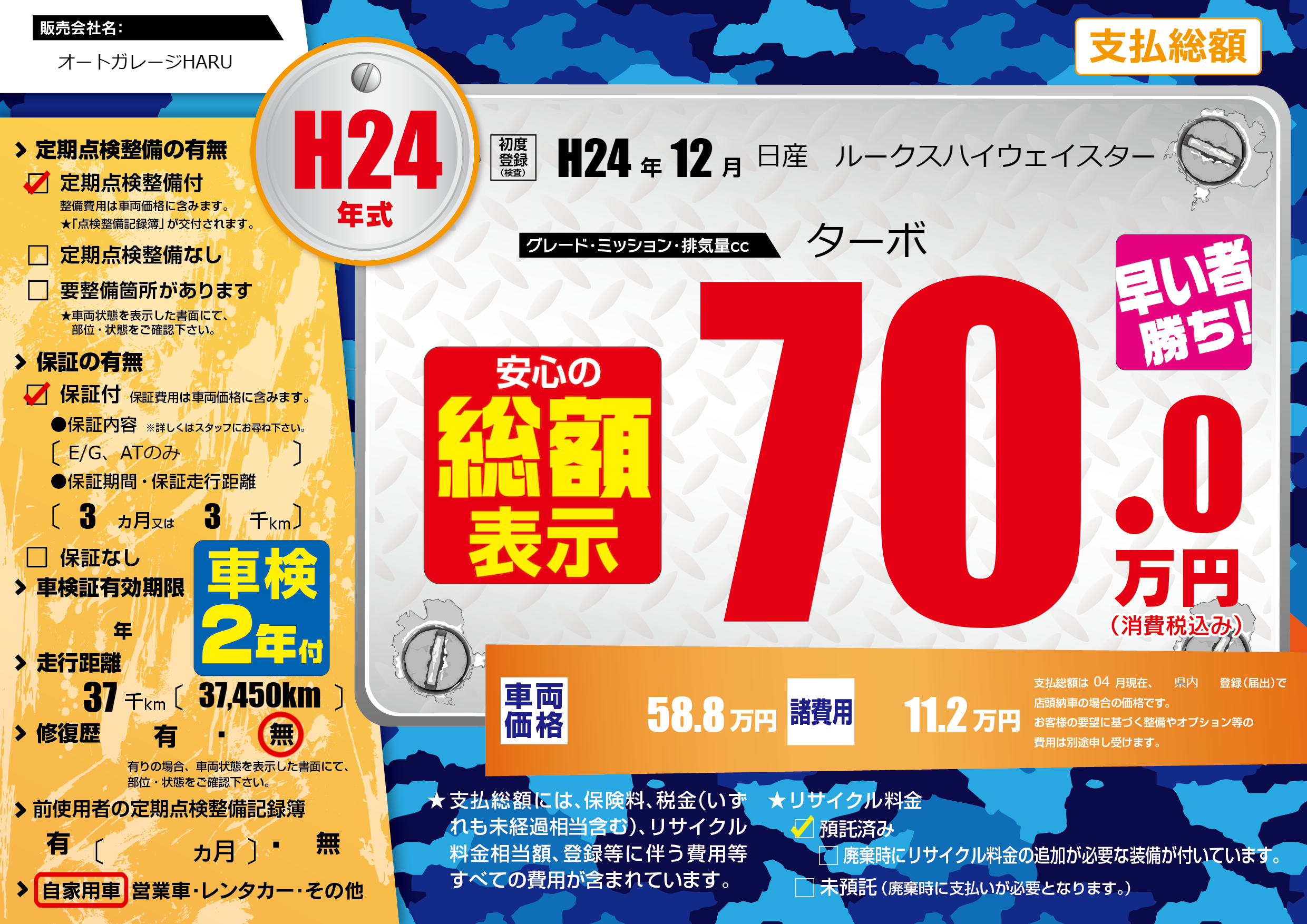 | 走行キロ | 3.7万km | 初年度登録 | H24年12月 |