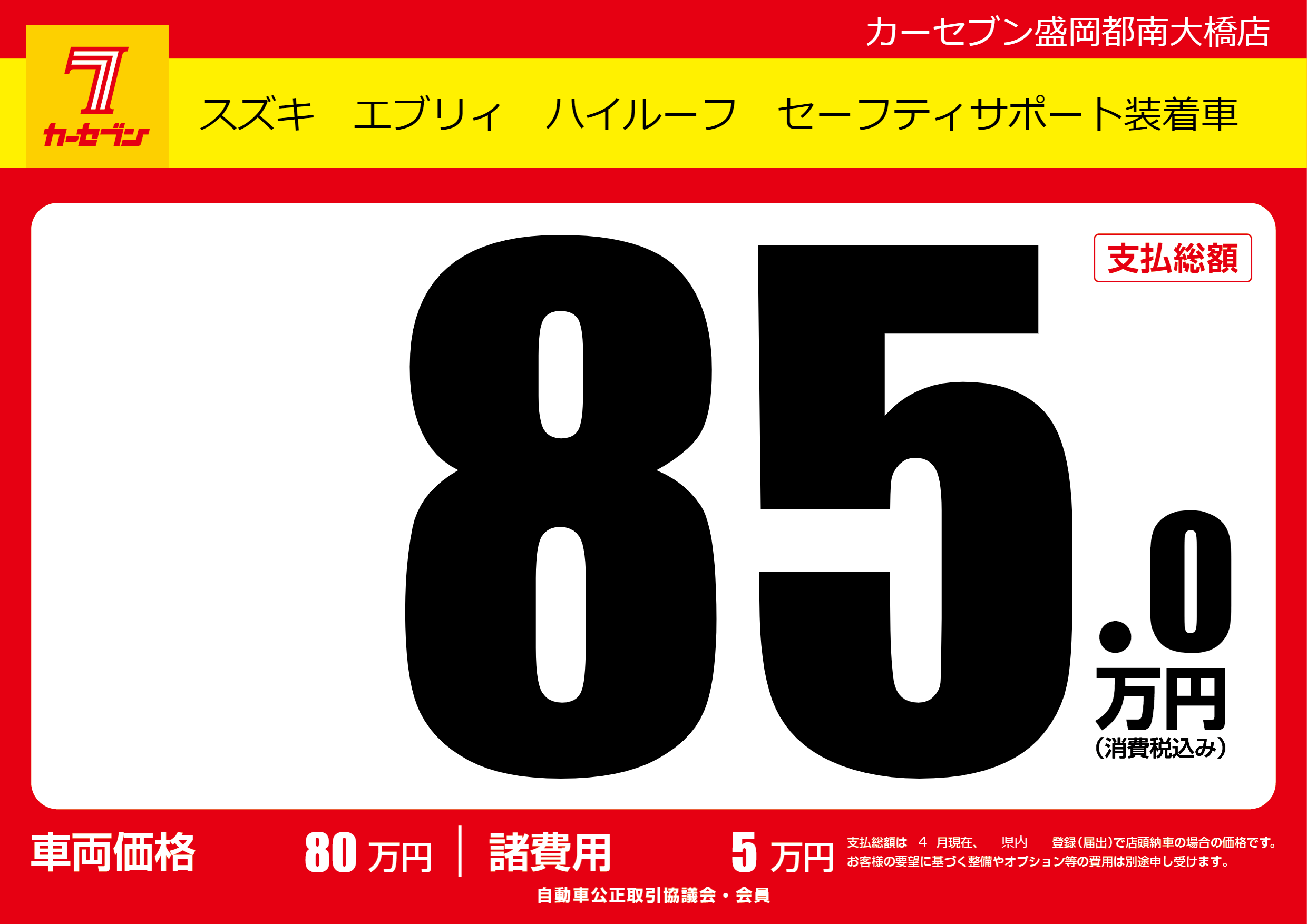 | 車名 | スズキ エブリィ ハイルーフ セーフティサポート装着車 | グレード ミッション 排気量 |