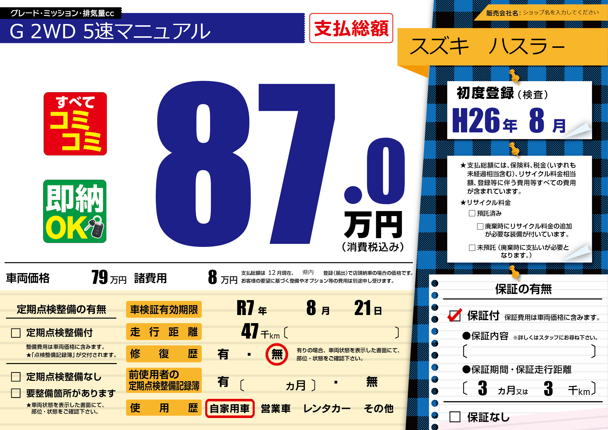 | 車名 | スズキ ハスラ- | グレード ミッション 排気量 |
