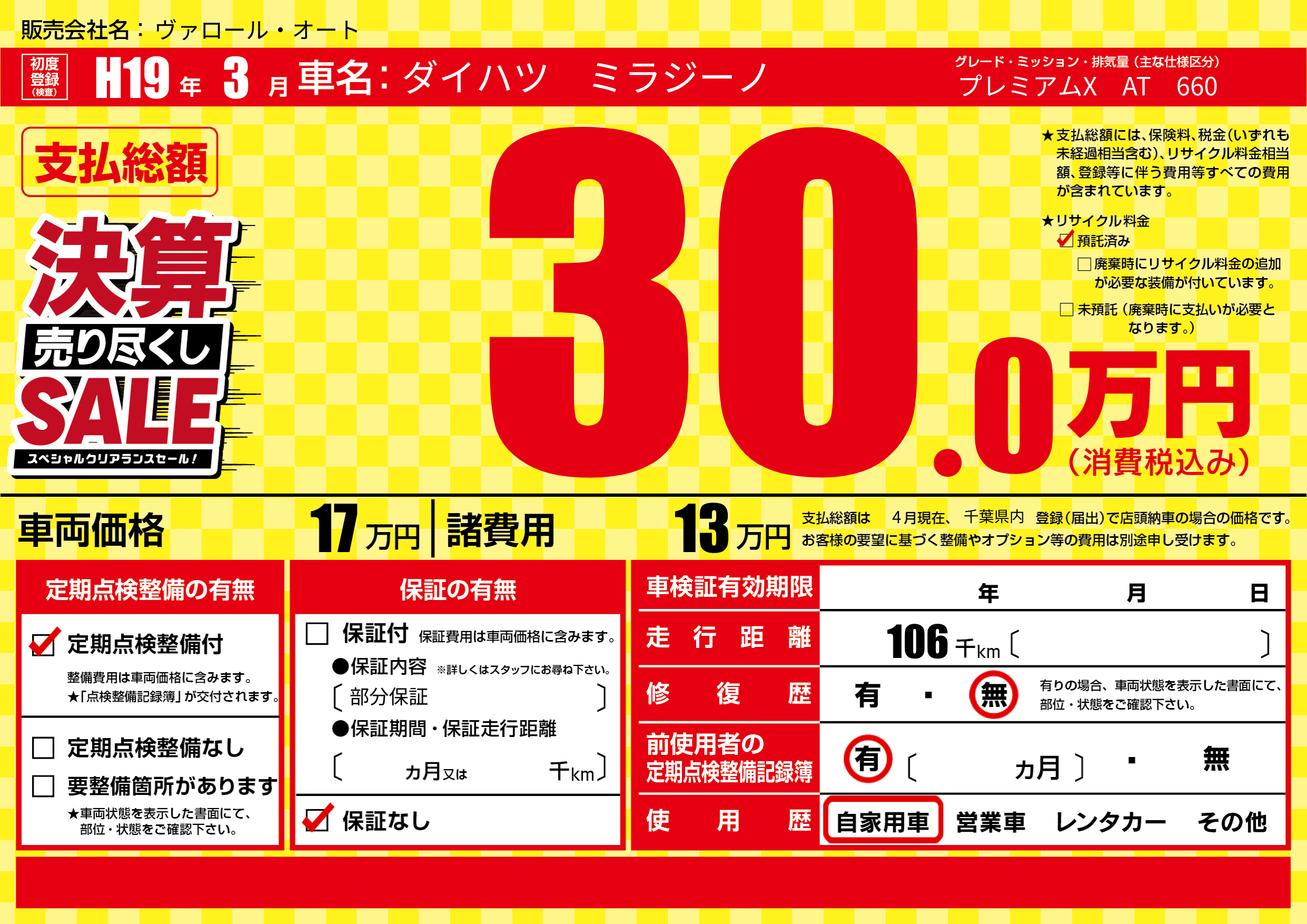 保証なし 保証内容(部分保証) ---ヶ月または()千kmまで |