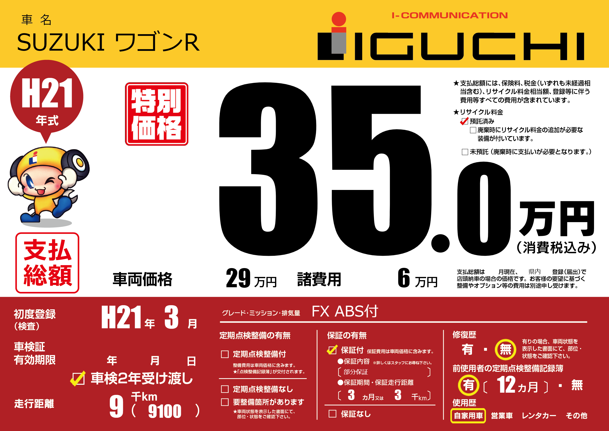 | 走行キロ | 0.9万km | 初年度登録 | H21年3月 |