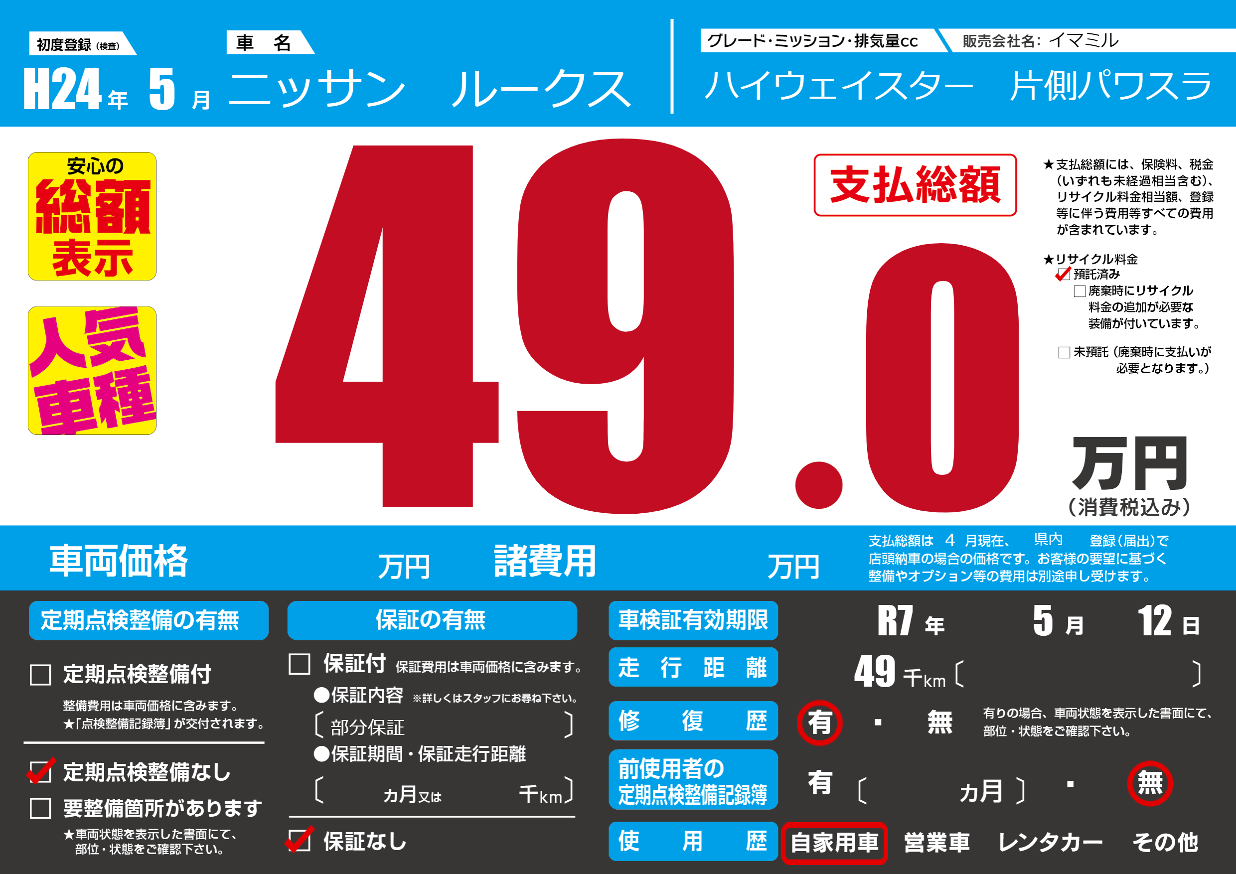 | 走行キロ | 4.9万km | 初年度登録 | H24年5月 |