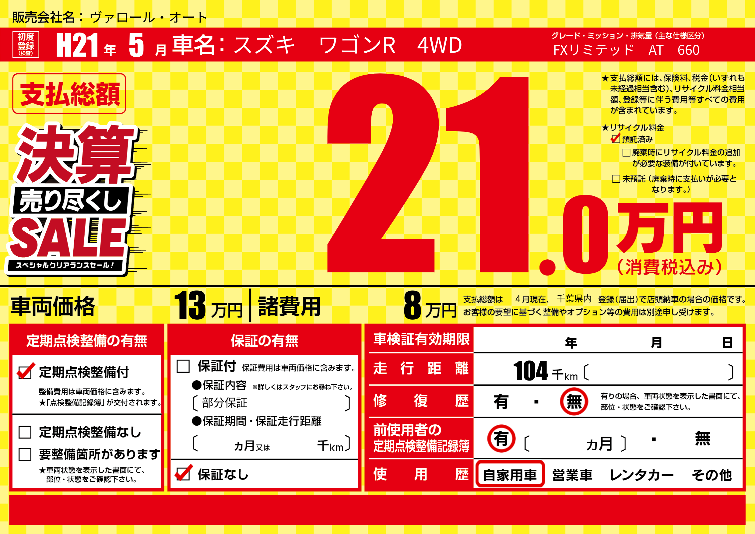 | 車名 | スズキ ワゴンR 4WD | グレード ミッション 排気量 |