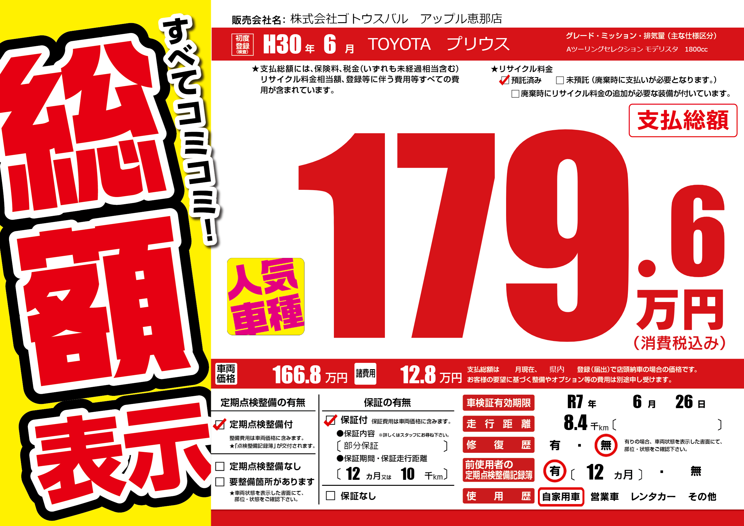 | 車名 | TOYOTA プリウス | グレード ミッション 排気量 |