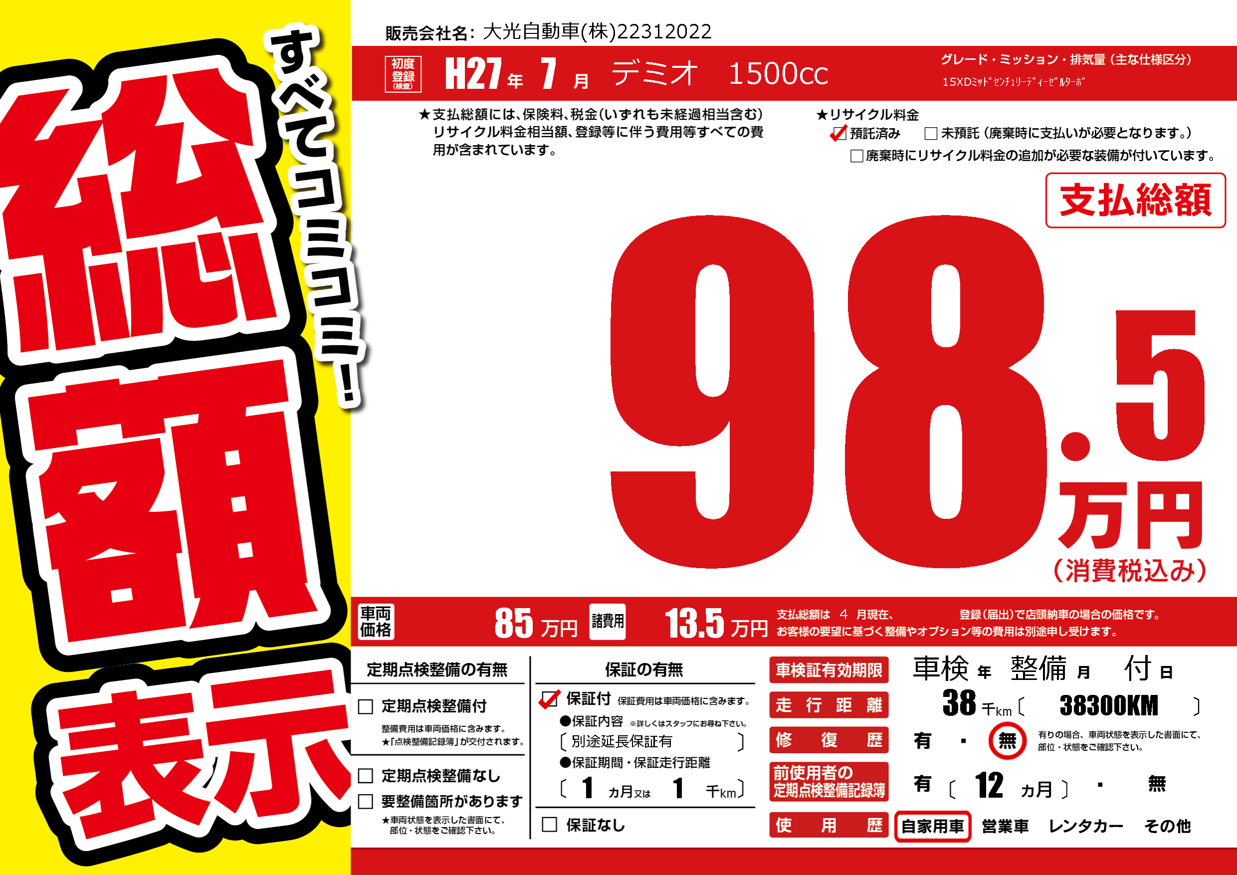 | 車名 | デミオ 1500cc | グレード ミッション 排気量 |