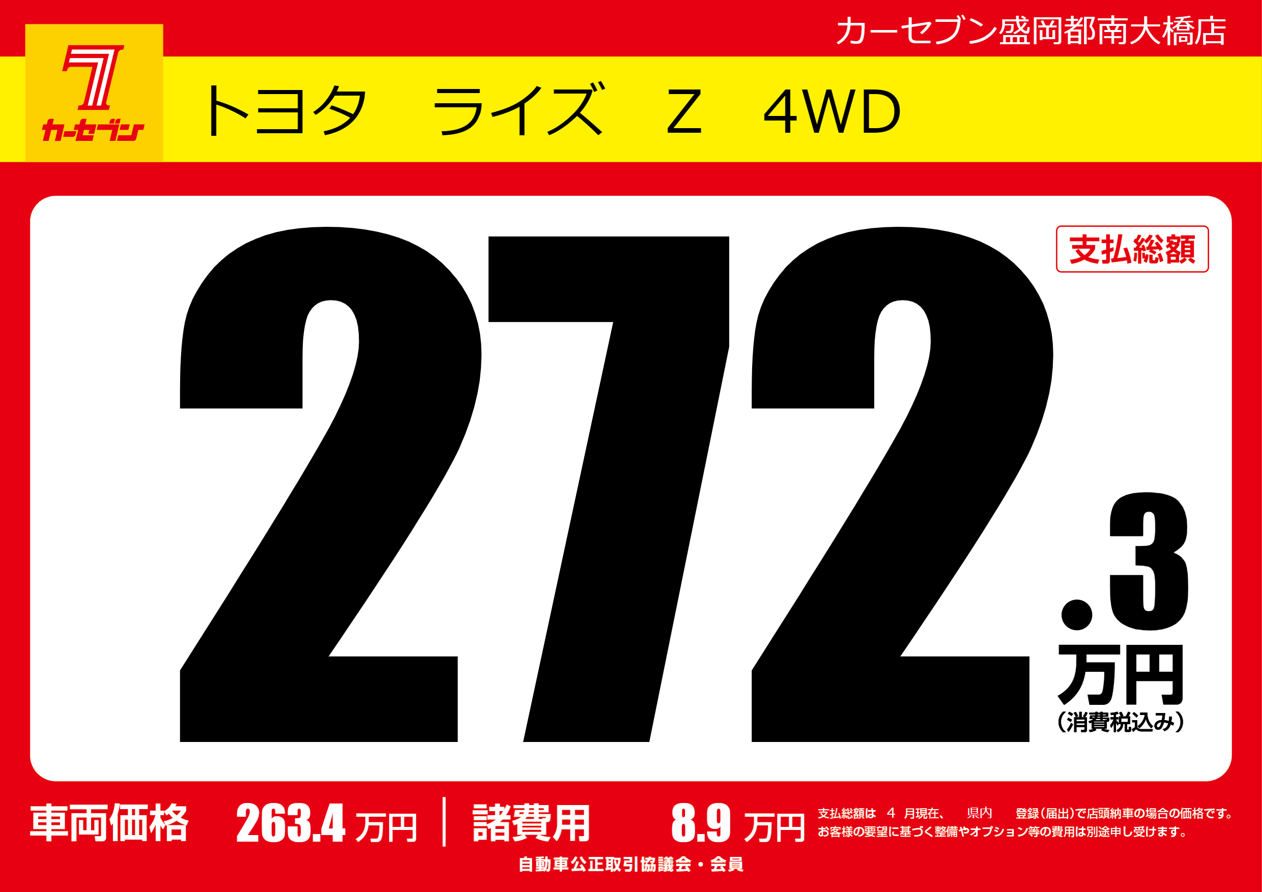 | 車名 | トヨタ ライズ Z 4WD | グレード ミッション 排気量 |