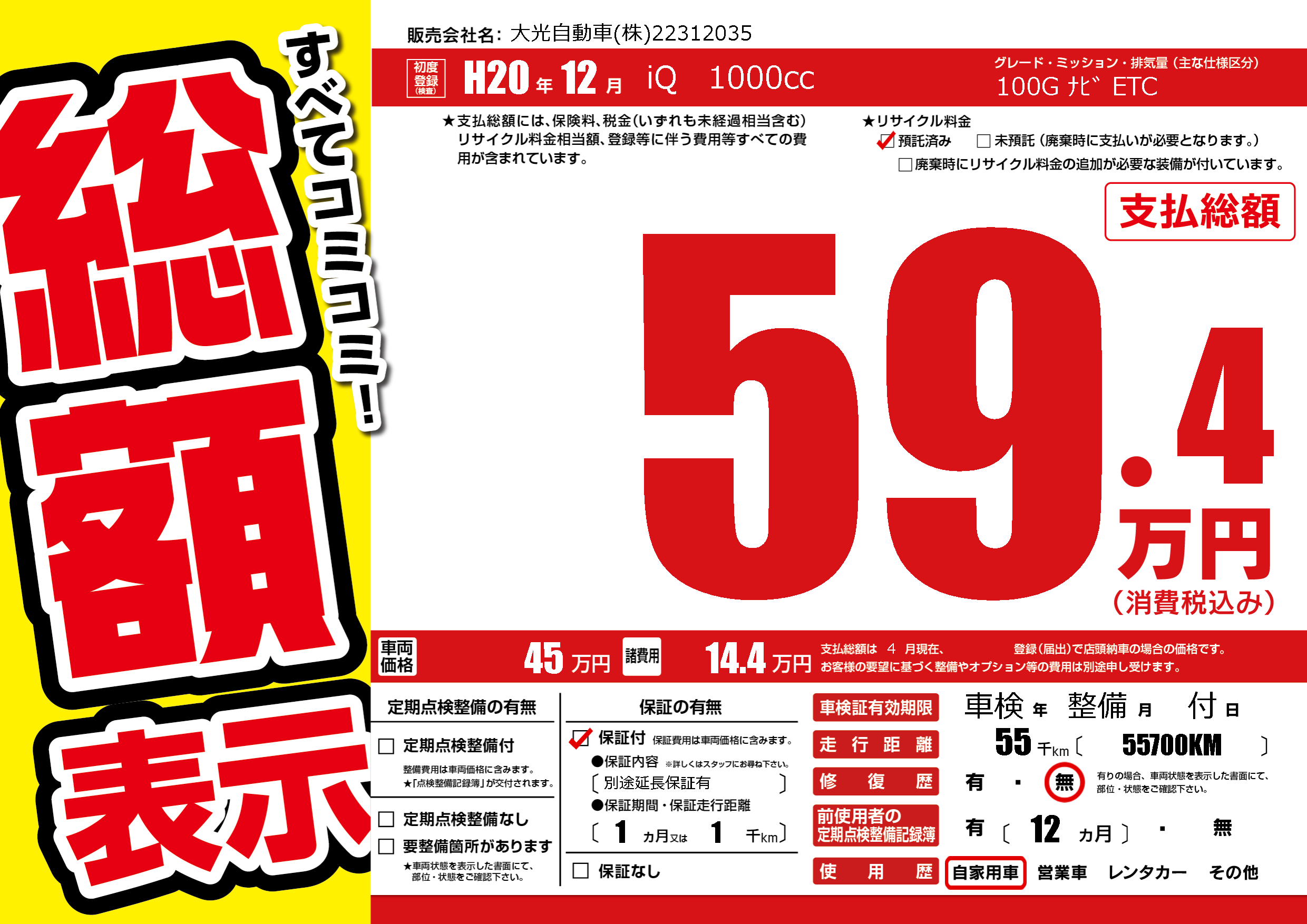 | 走行キロ | 5.5万km | 初年度登録 | H20年12月 |