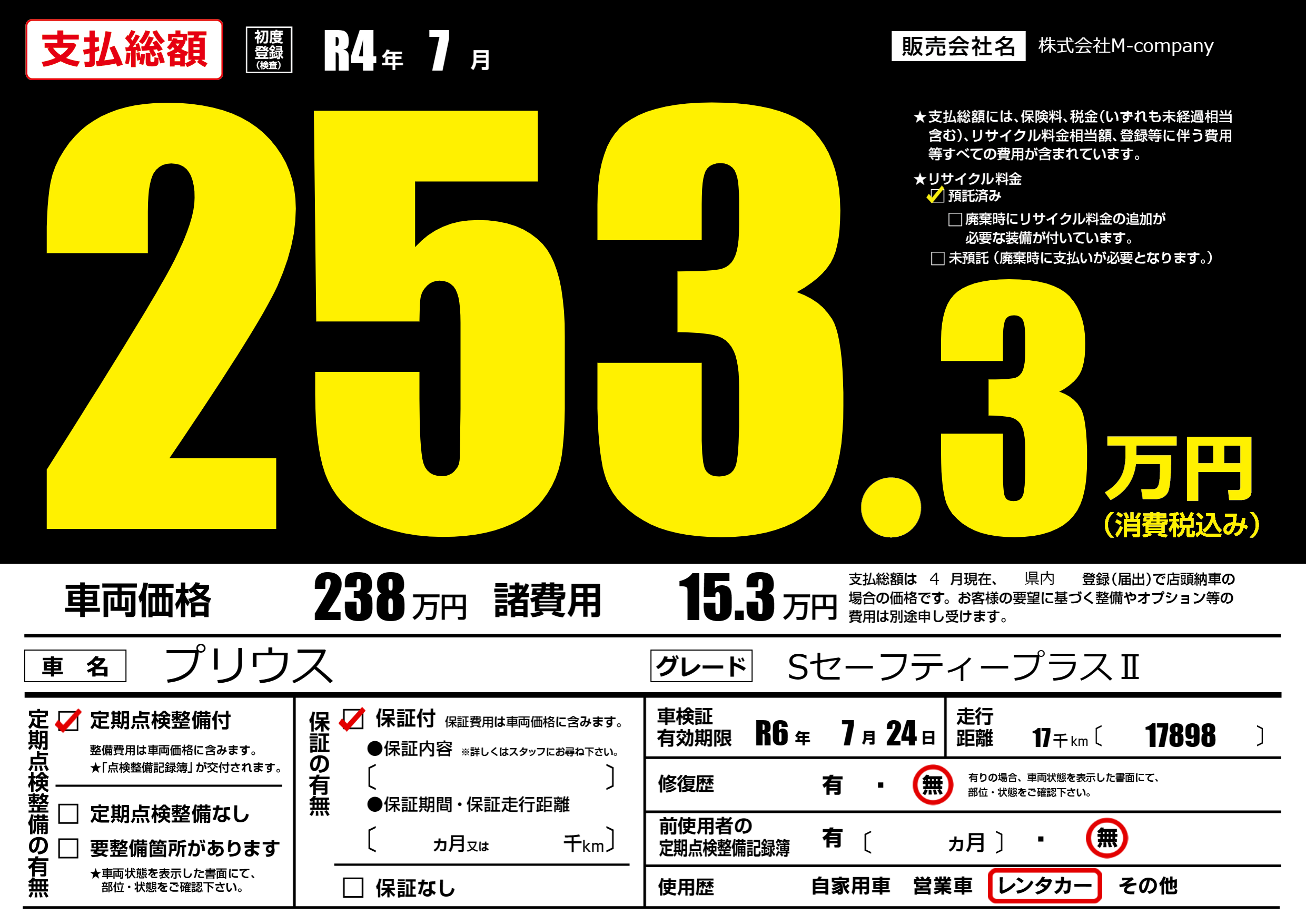| 車名 | プリウス | グレード ミッション 排気量 |