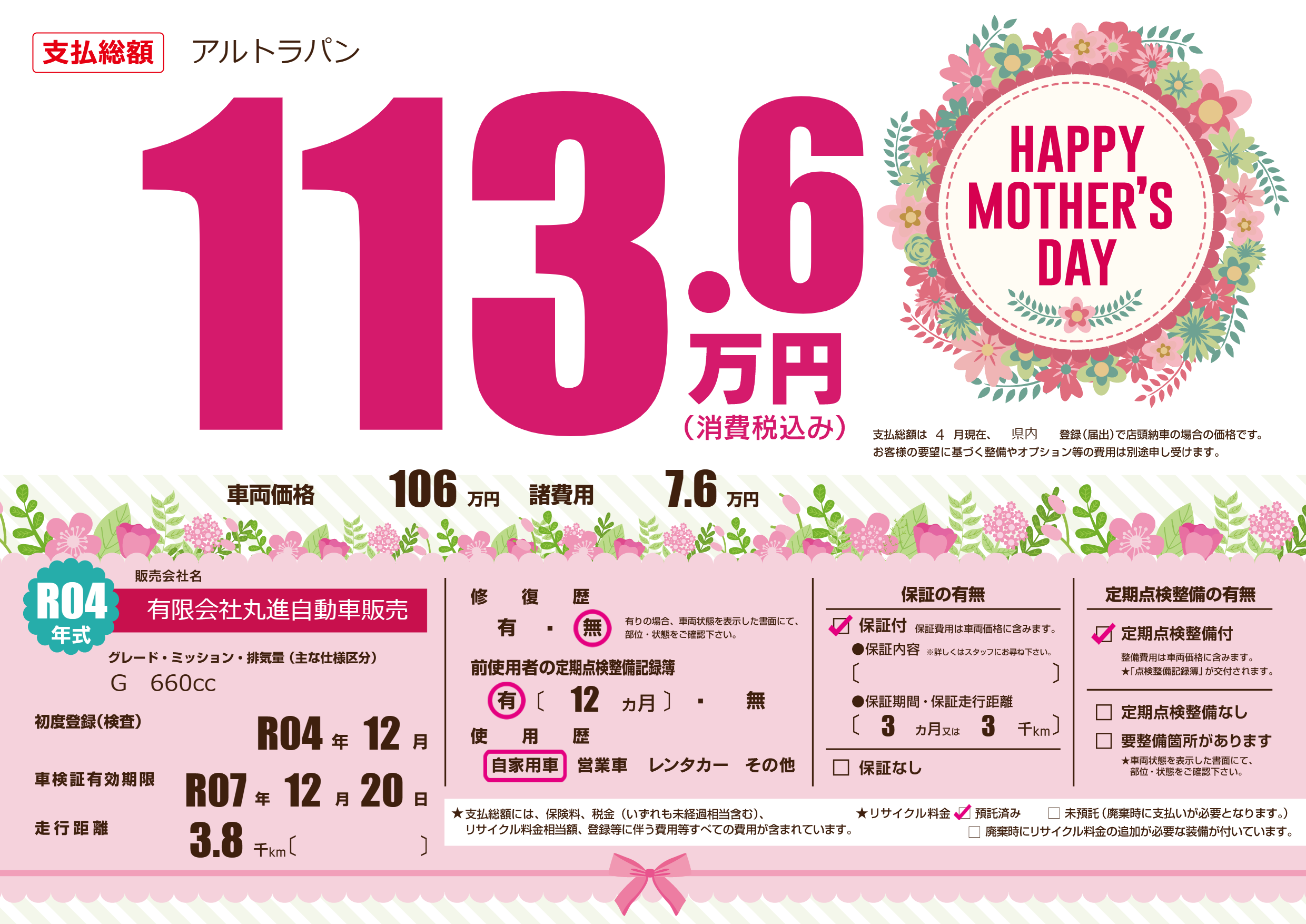 | 走行キロ | 0.3万km | 初年度登録 | R04年12月 |