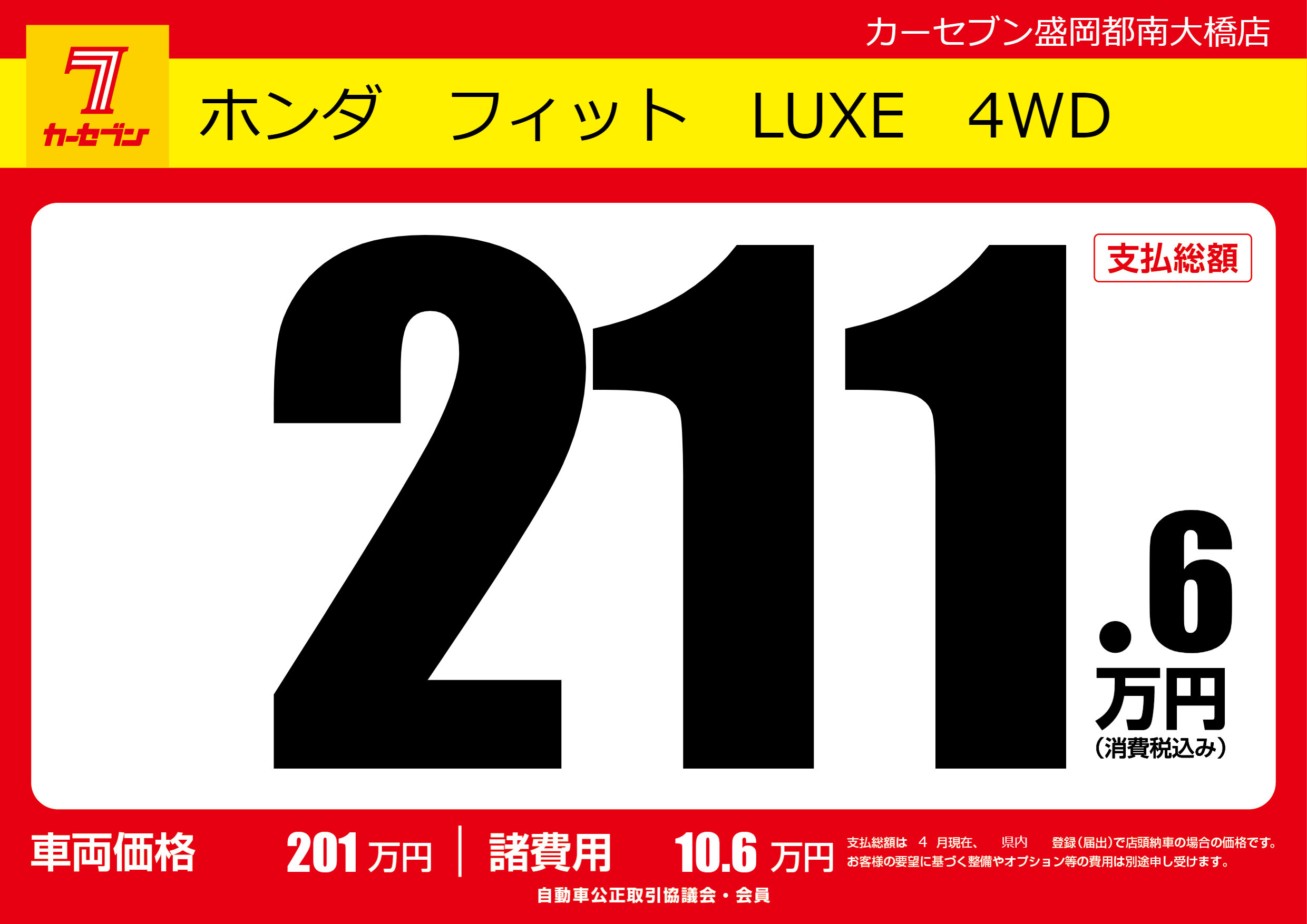 | 車名 | ホンダ フィット LUXE 4WD | グレード ミッション 排気量 |