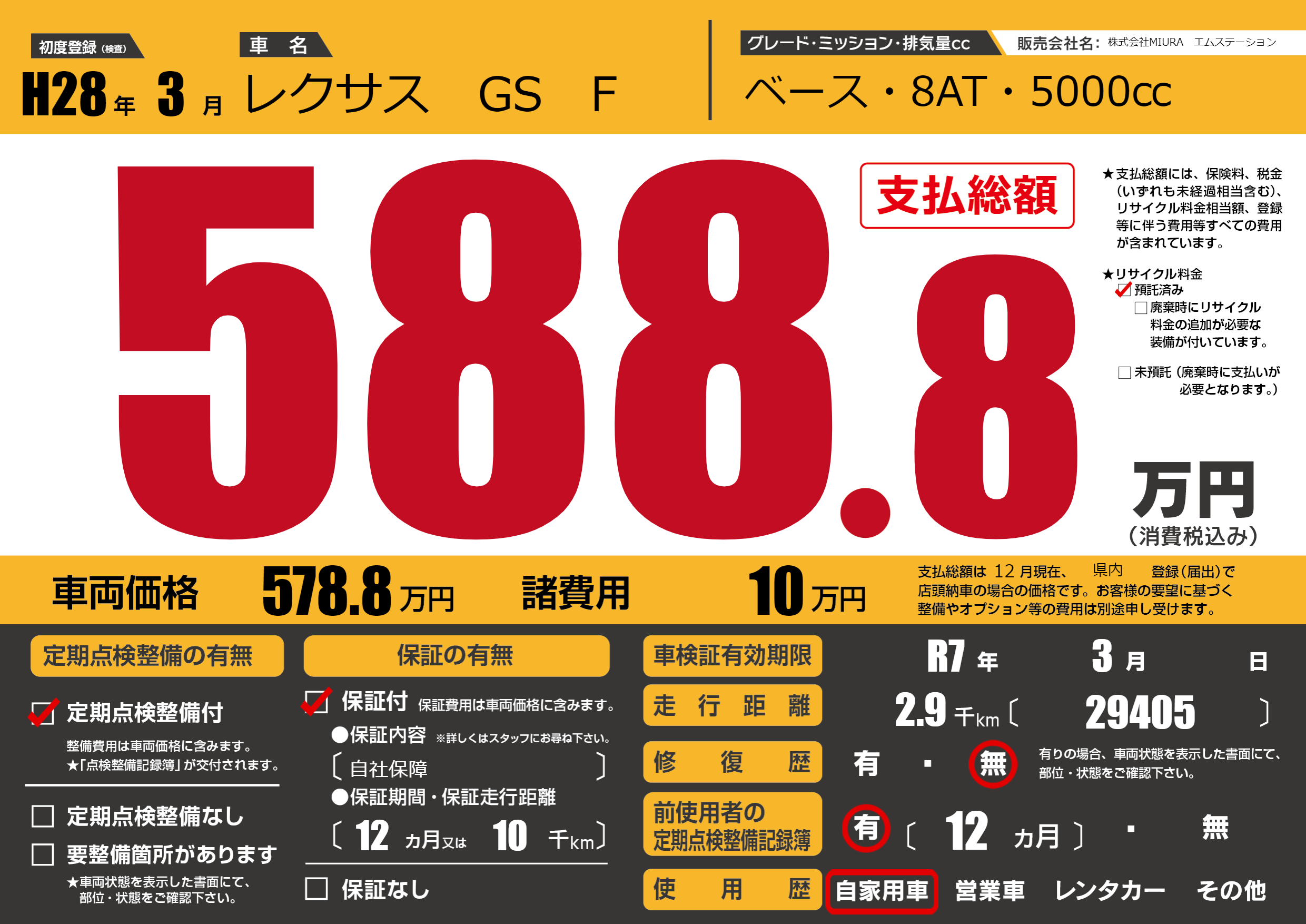 | 車名 | レクサス GS F | グレード ミッション 排気量 |