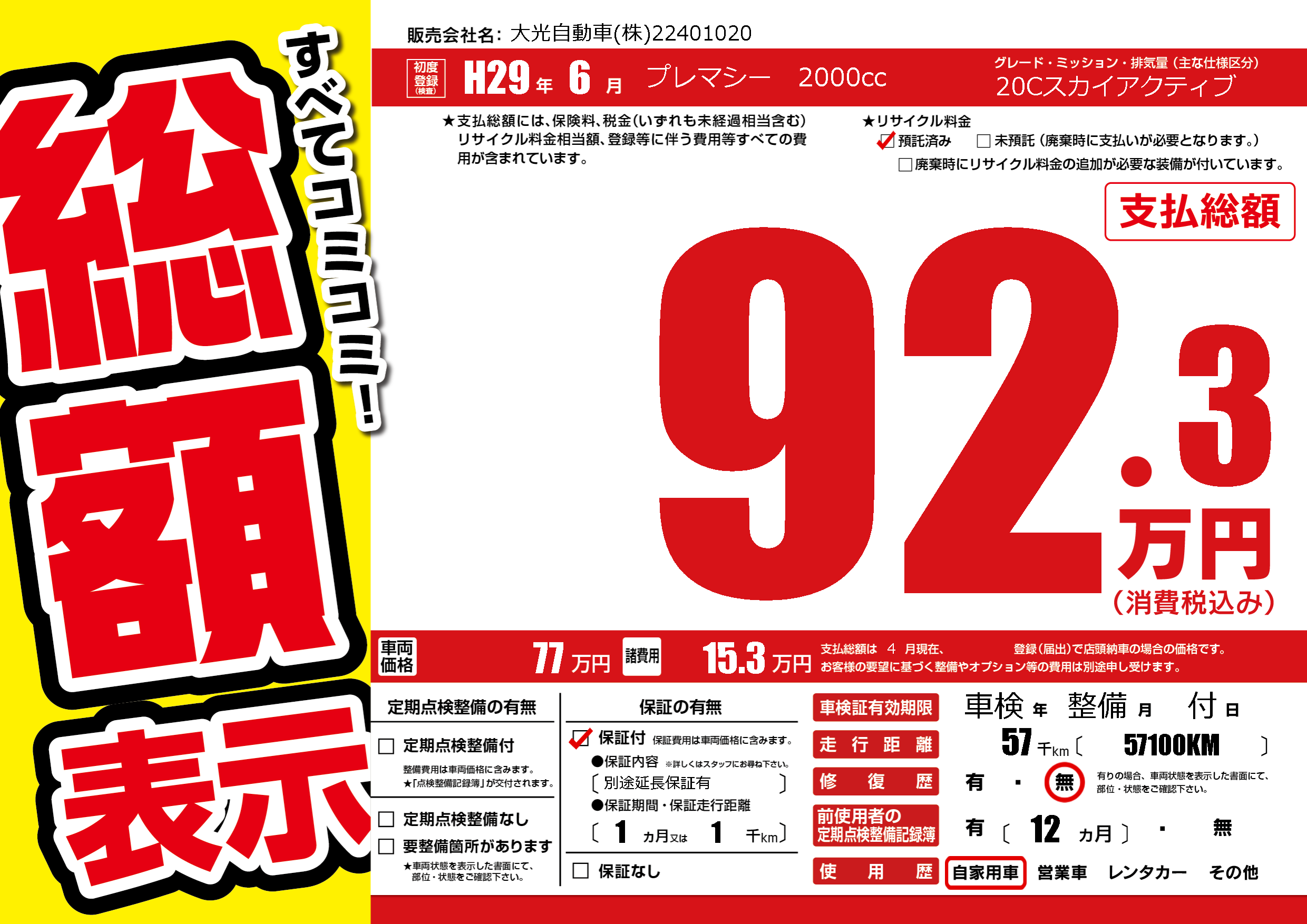 | 車名 | プレマシー 2000cc | グレード ミッション 排気量 |