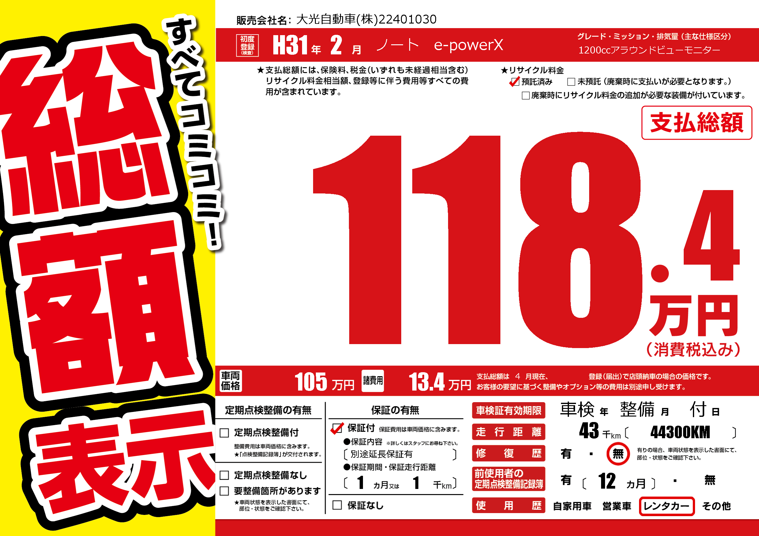 | 車名 | ノート e-powerX | グレード ミッション 排気量 |