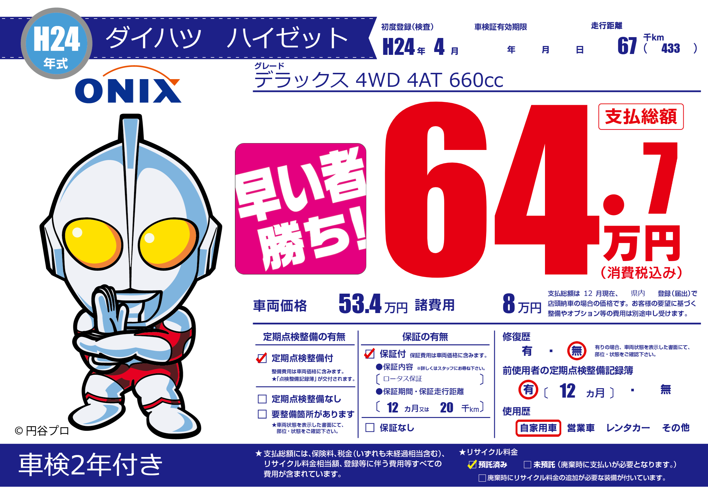 | 走行キロ | 6.7万km | 初年度登録 | H24年4月 |