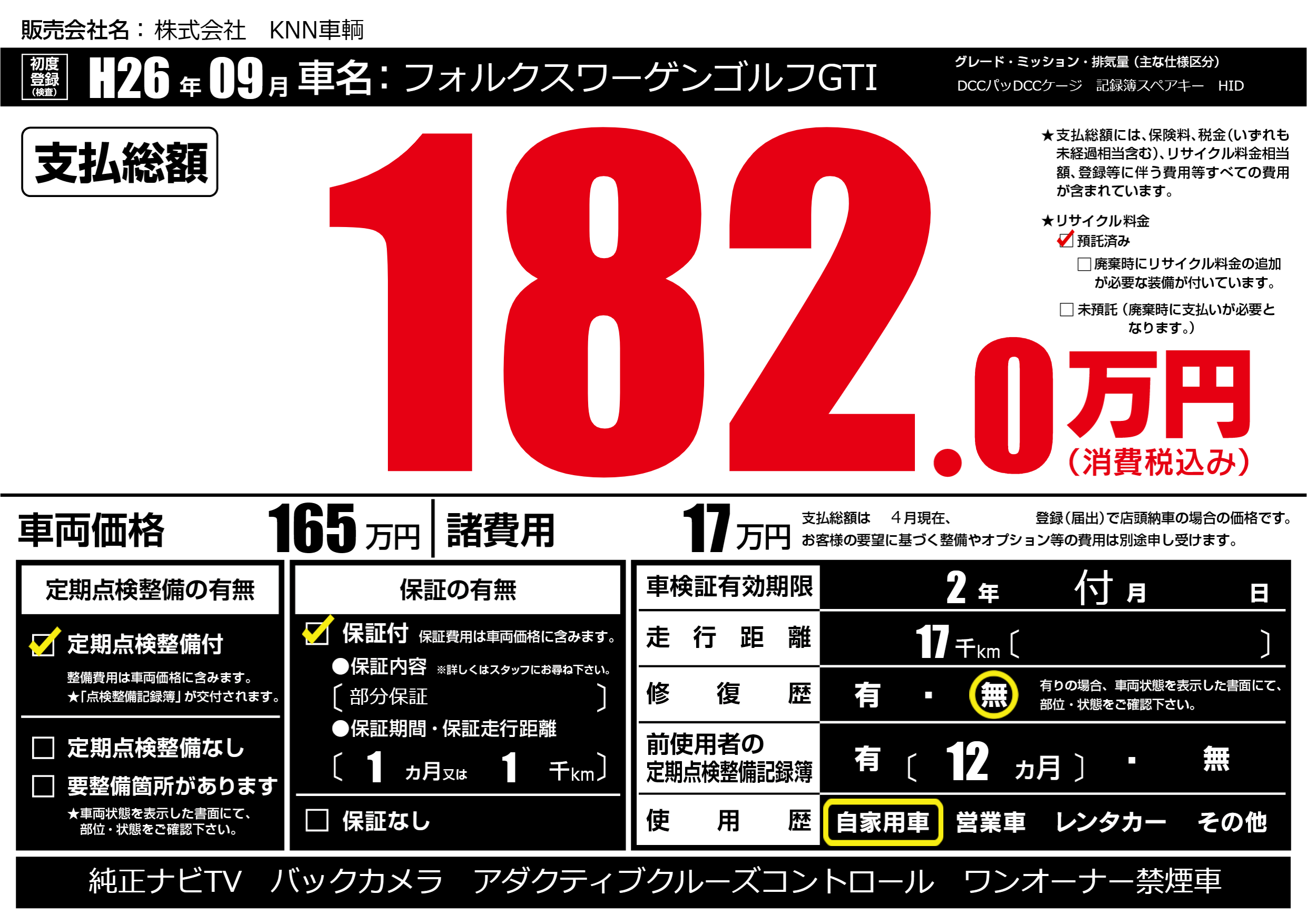 | 車名 | フォルクスワーゲンゴルフGTI | グレード ミッション 排気量 |