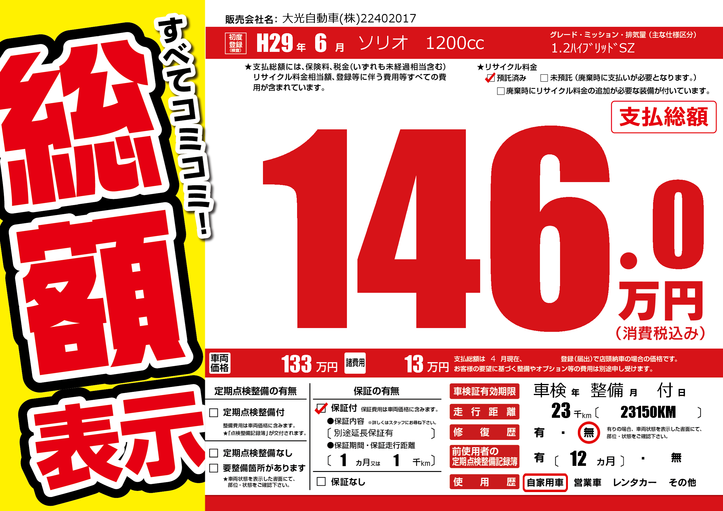 | 車名 | ソリオ 1200cc | グレード ミッション 排気量 |