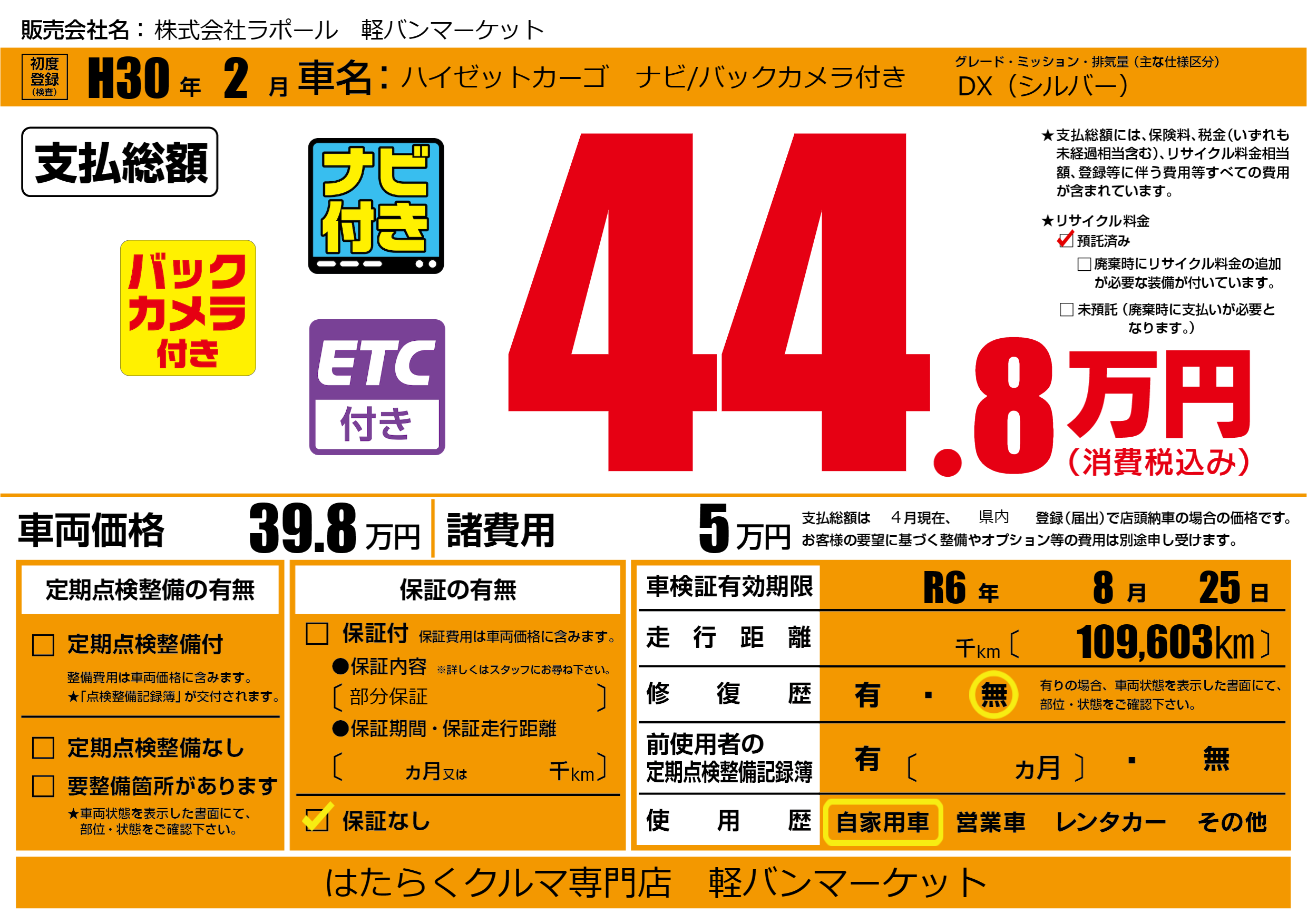 なし | 車検制限 | R6年8月25月 |