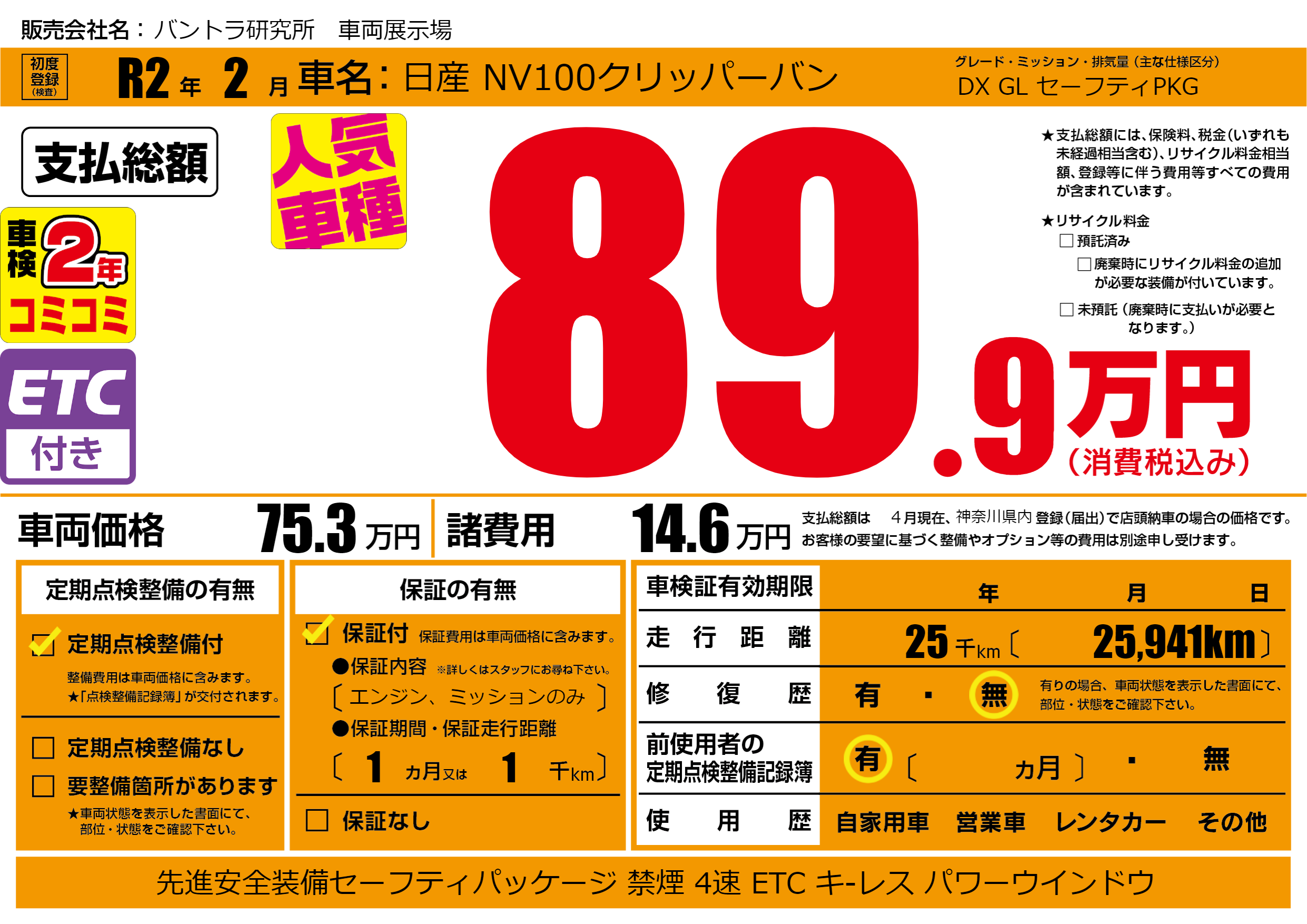 | 車名 | 日産 NV100クリッパーバン | グレード ミッション 排気量 |