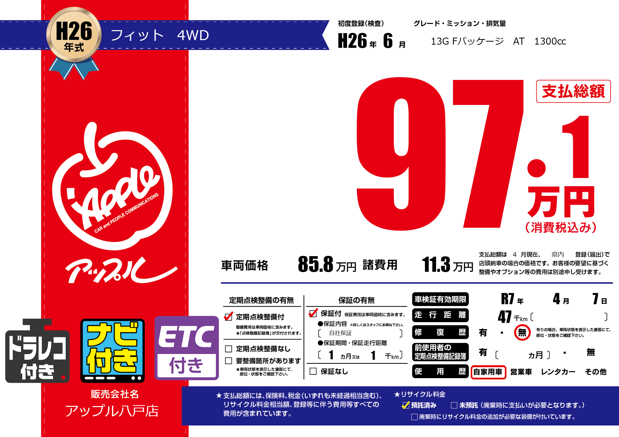 | 車検制限 | R7年 4月 7日 | ||