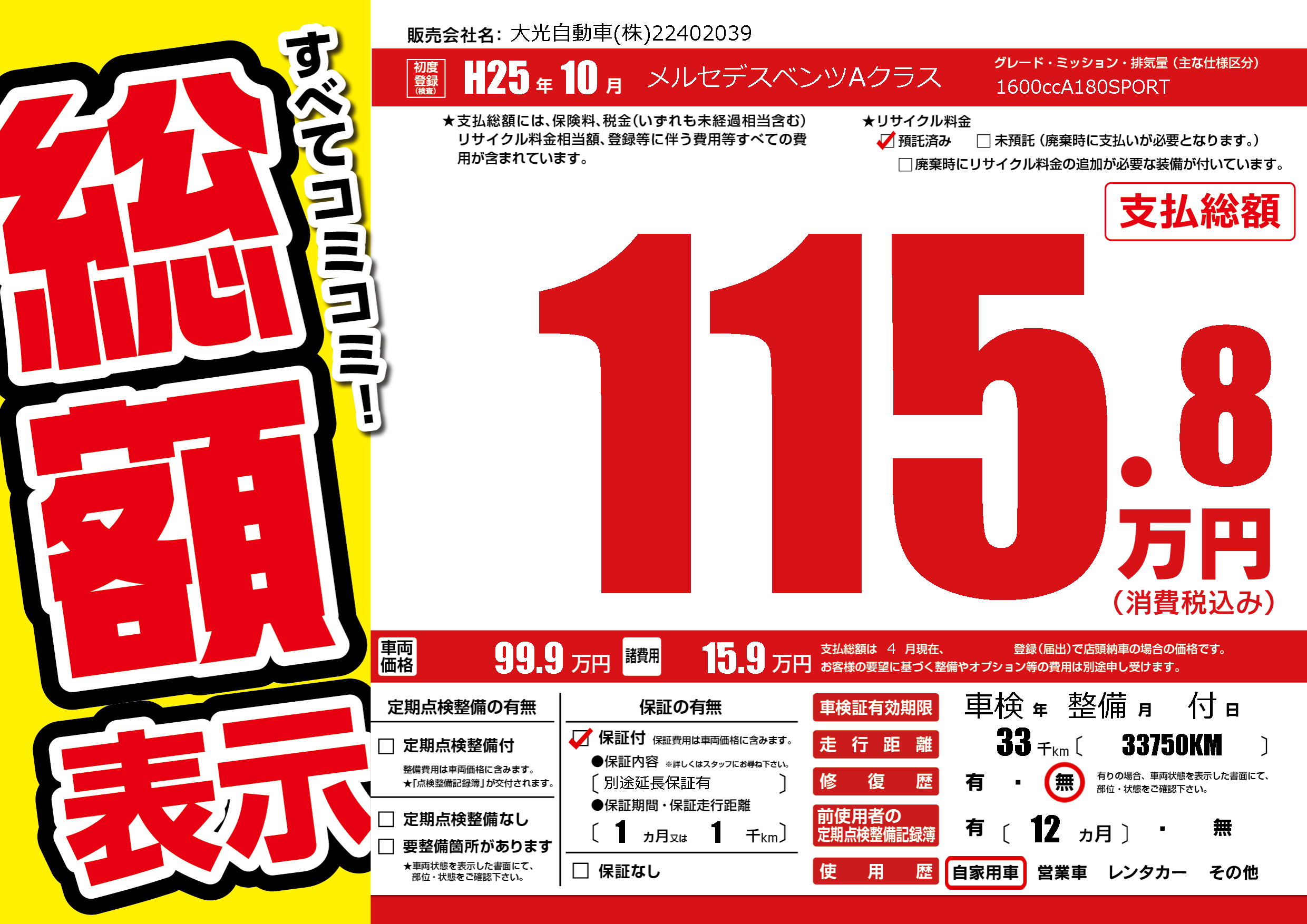 | 車名 | メルセデスベンツAクラス | グレード ミッション 排気量 |