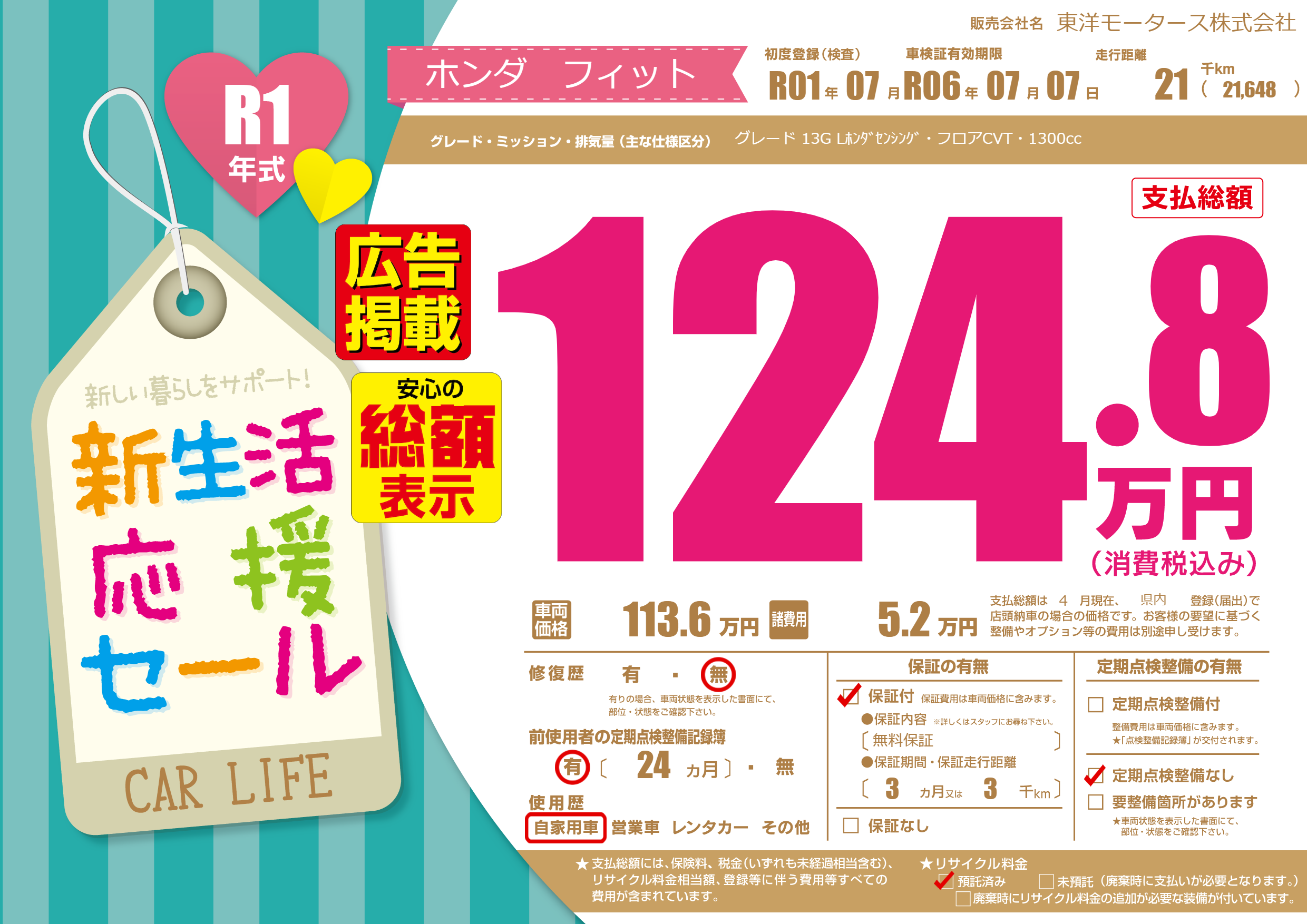 | 車名 | ホンダ フィット | グレード ミッション 排気量 |