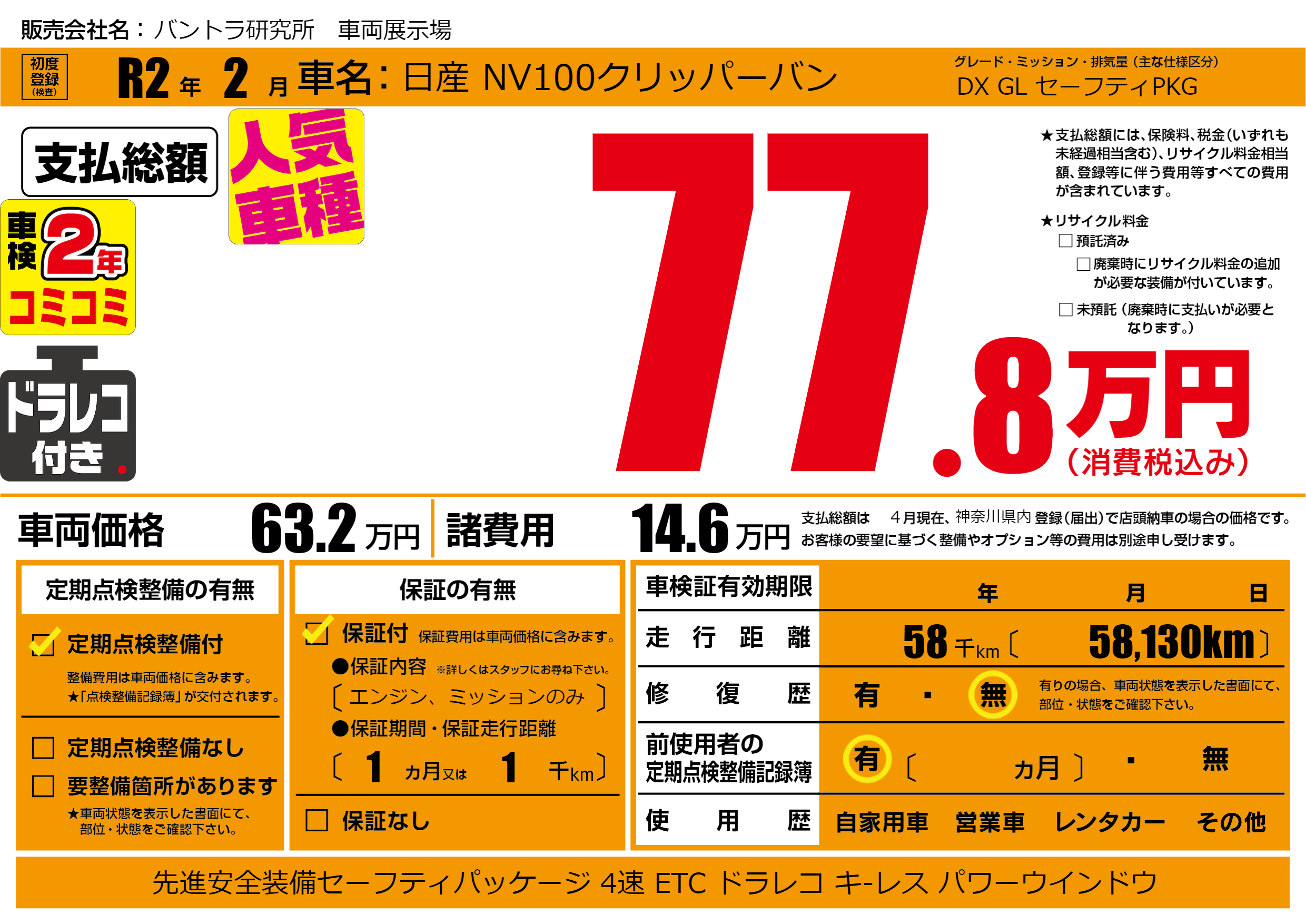 | 車名 | 日産 NV100クリッパーバン | グレード ミッション 排気量 |