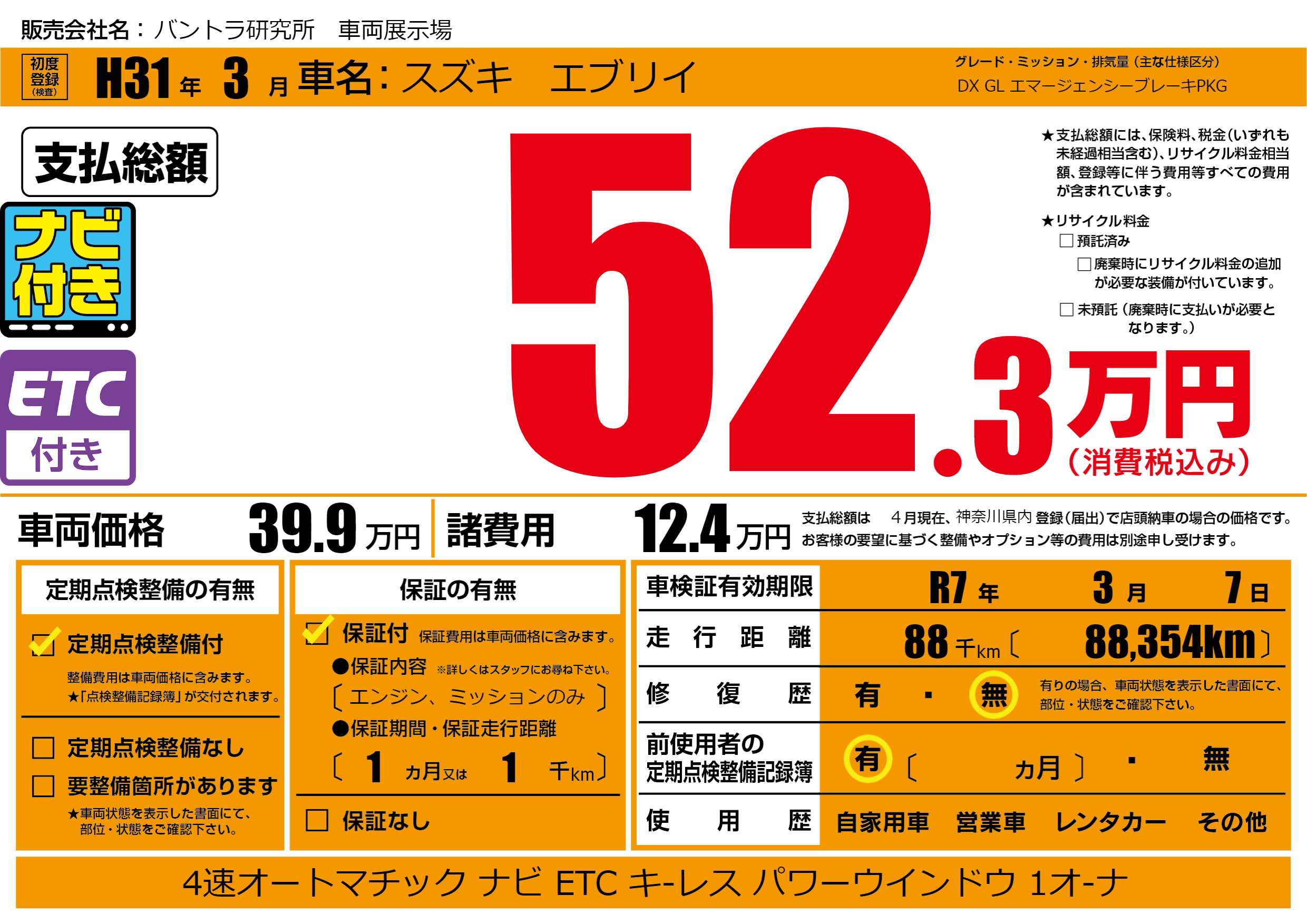 | 車名 | スズキ エブリイ | グレード ミッション 排気量 |
